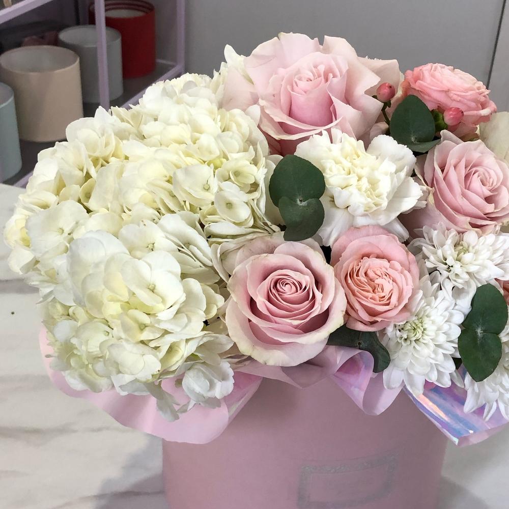 Гортензия - 1 шт. Хризантема кустовая - 3 шт. Диантус - 5 шт. Роза пионовидная кустовая - 4 шт. Шляпная коробка - 1 шт. Роза Софи Лорен - 3 шт.