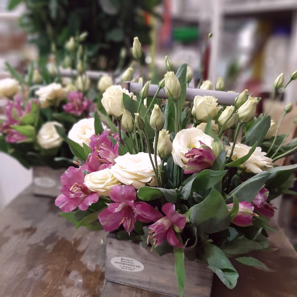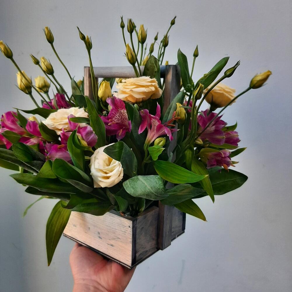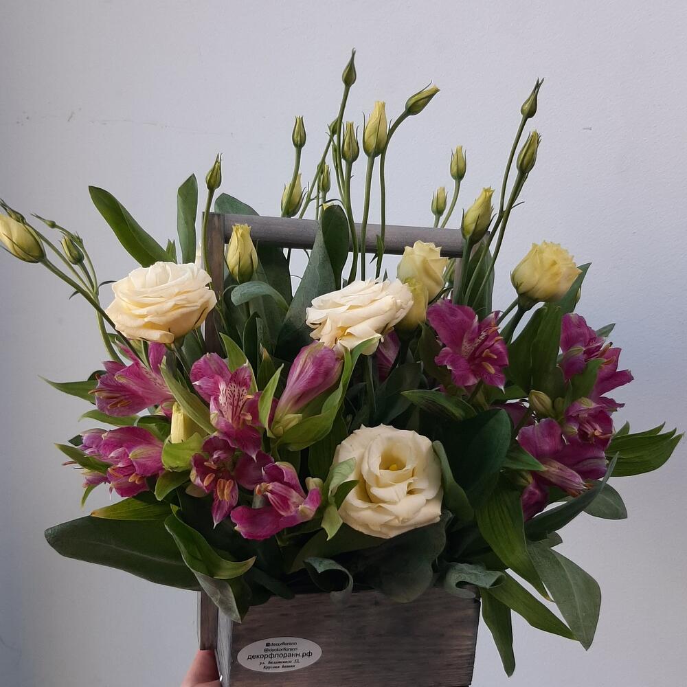 Эустома с альстромериями в деревянном ящике