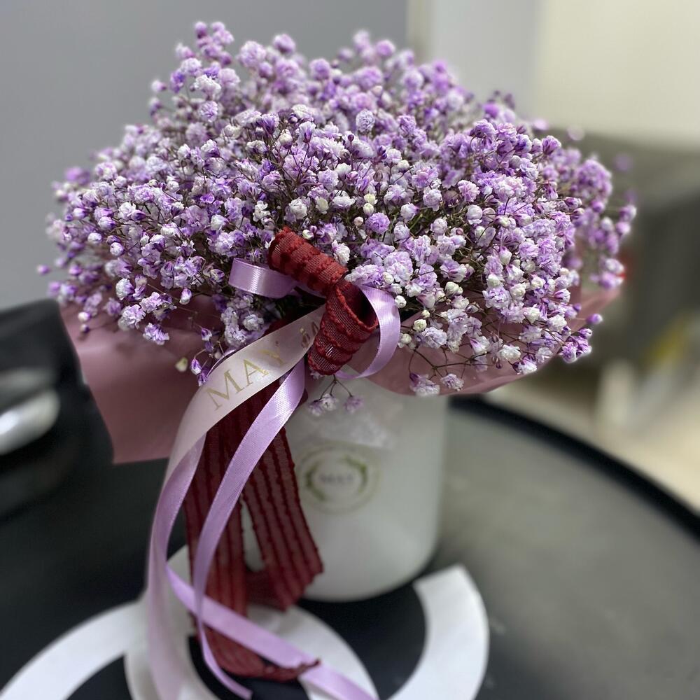 Прекрасный выбор – гипсофила в коробочке. Не требует усилий в уходе. Высыхает и становится сухоцветом. Будет радовать вас долго .. очень долго