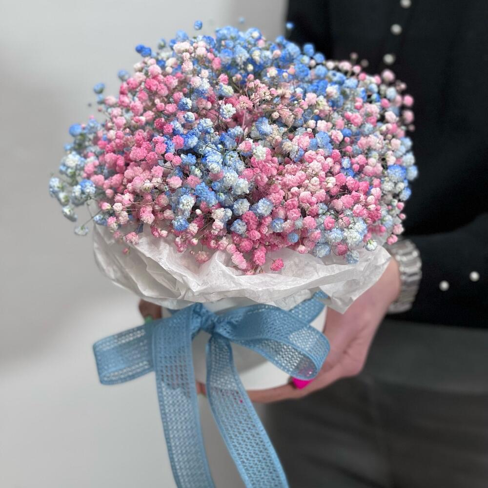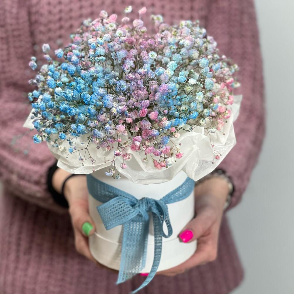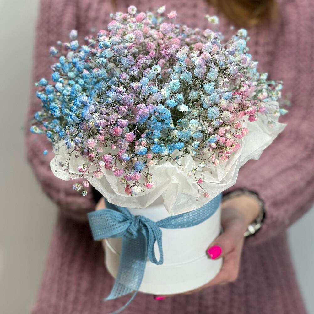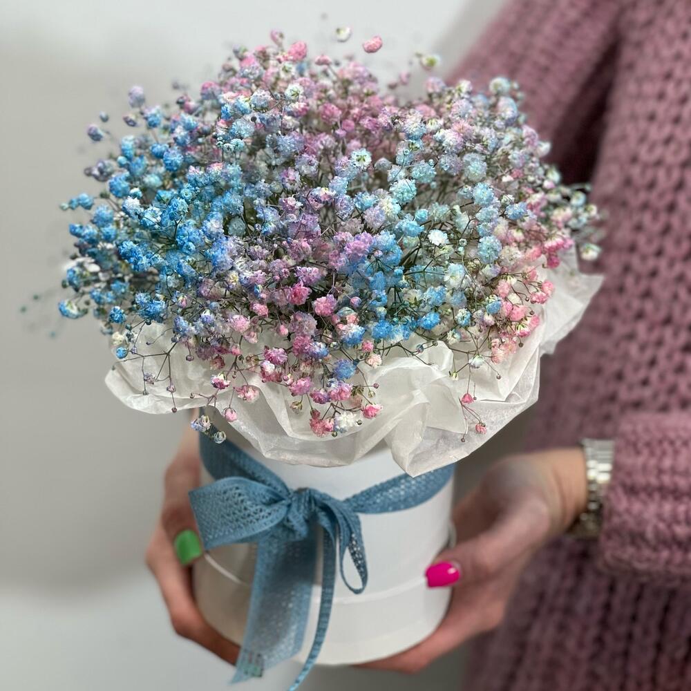 Коробка из гипсофилы – это всегда универсальный подарок, который можно подарить практически по любому поводу. Будь то день рождения или свидание, либо если Вы просто хотите напомнить о себе ☺️А так же букет в шляпной коробке – это еще и удобно, ведь не нужно думать куда поставить цветы, достаточно просто периодически подливать воду на флористическую губку, в которой стоит композиция из цветов Гипсофила один из самых стойких цветов, которые впоследствии очень удобно становятся сухоцветом и совсем не теряют своего внешнего вида, благодаря чему веточки гипсофилы можно использовать дома в качестве предмета интерьера 🏠