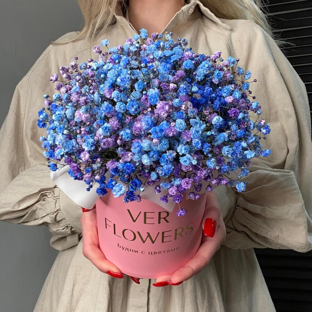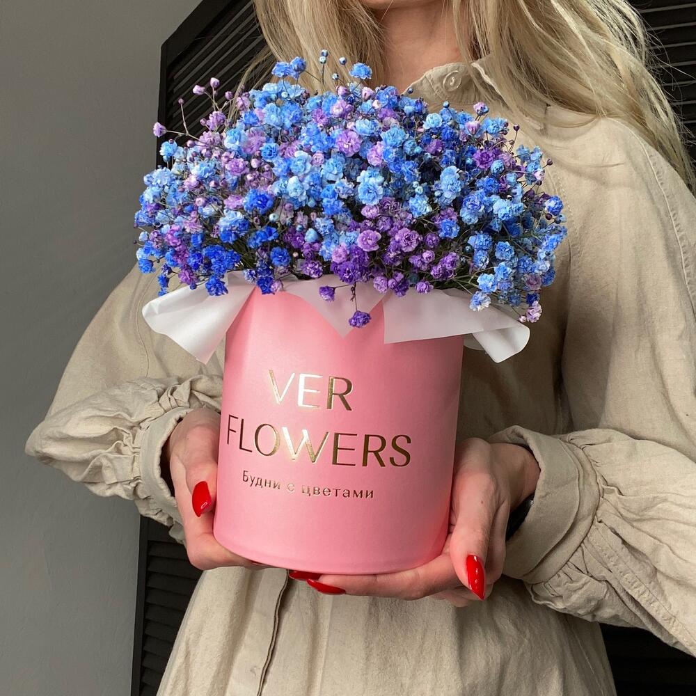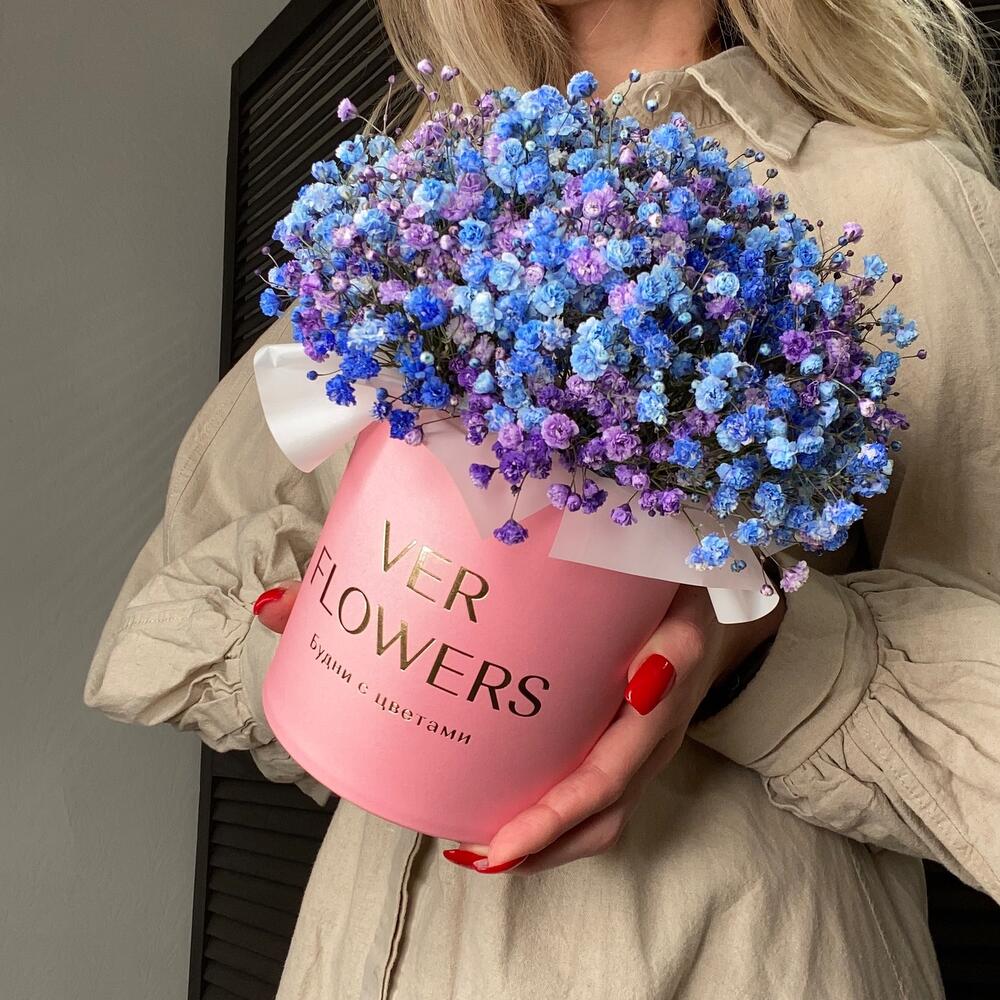 Воздушная цветная гипсофила в коробочке станет украшением любого праздника. Миниатюрное облачко в атмосфере нежности и уюта будет радовать долгое время