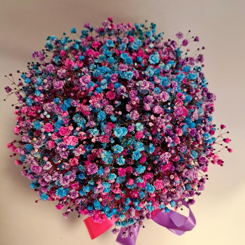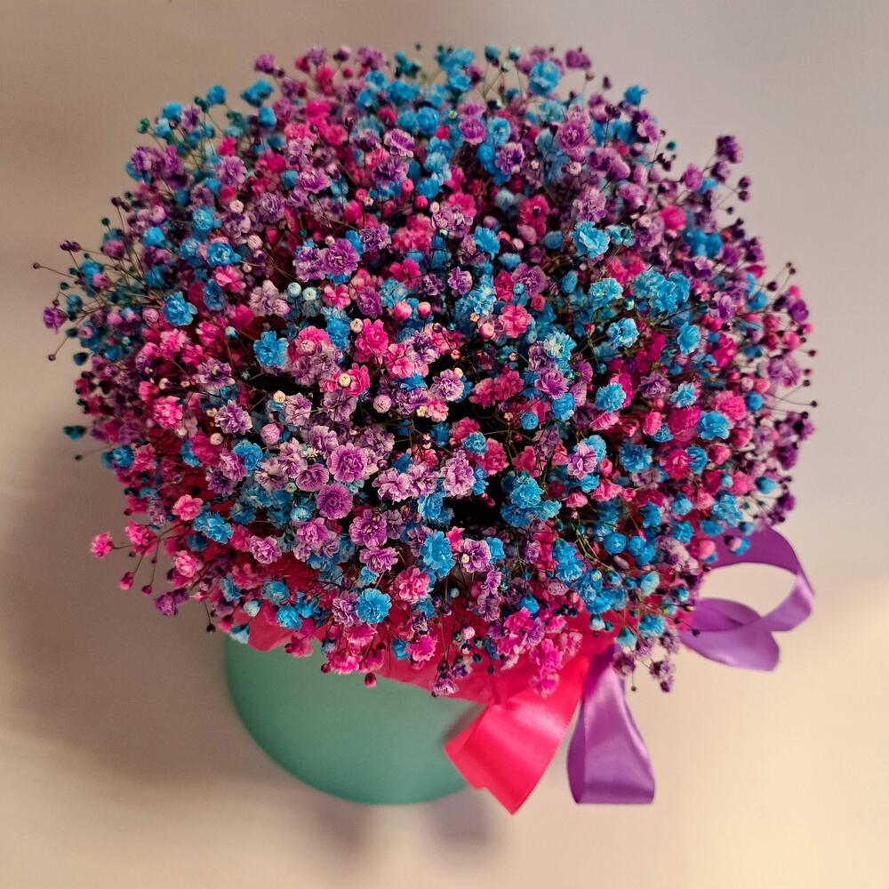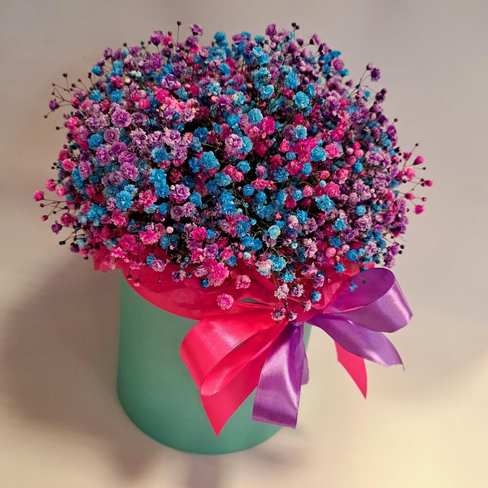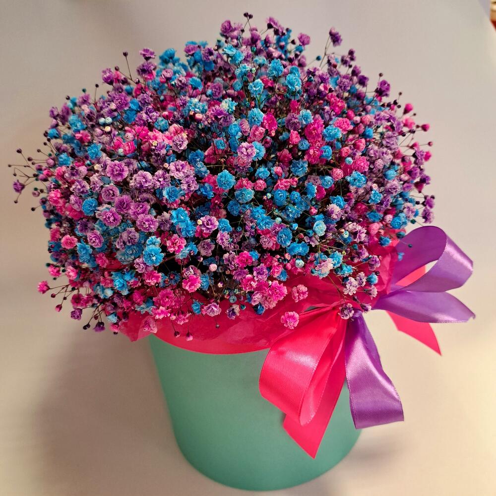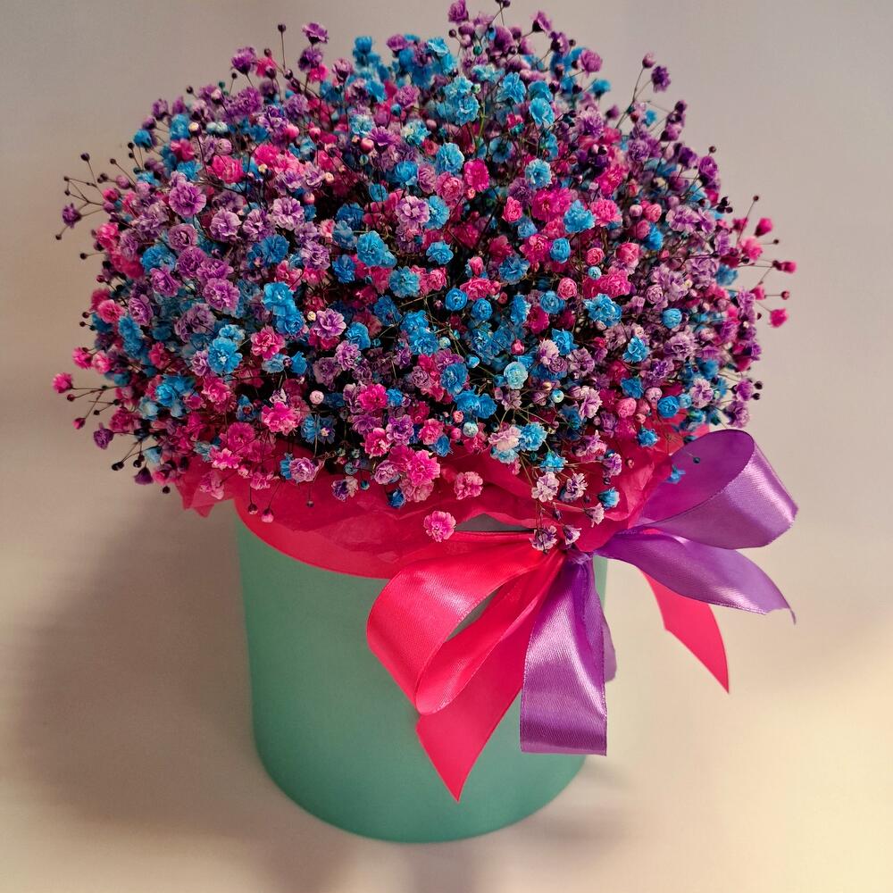 Лента атласная - 2 шт. Тишью - 2 шт. Коробка шляпная - 1 шт. Оазис флористический - 1 шт. гипсофила радужная - 9 шт.