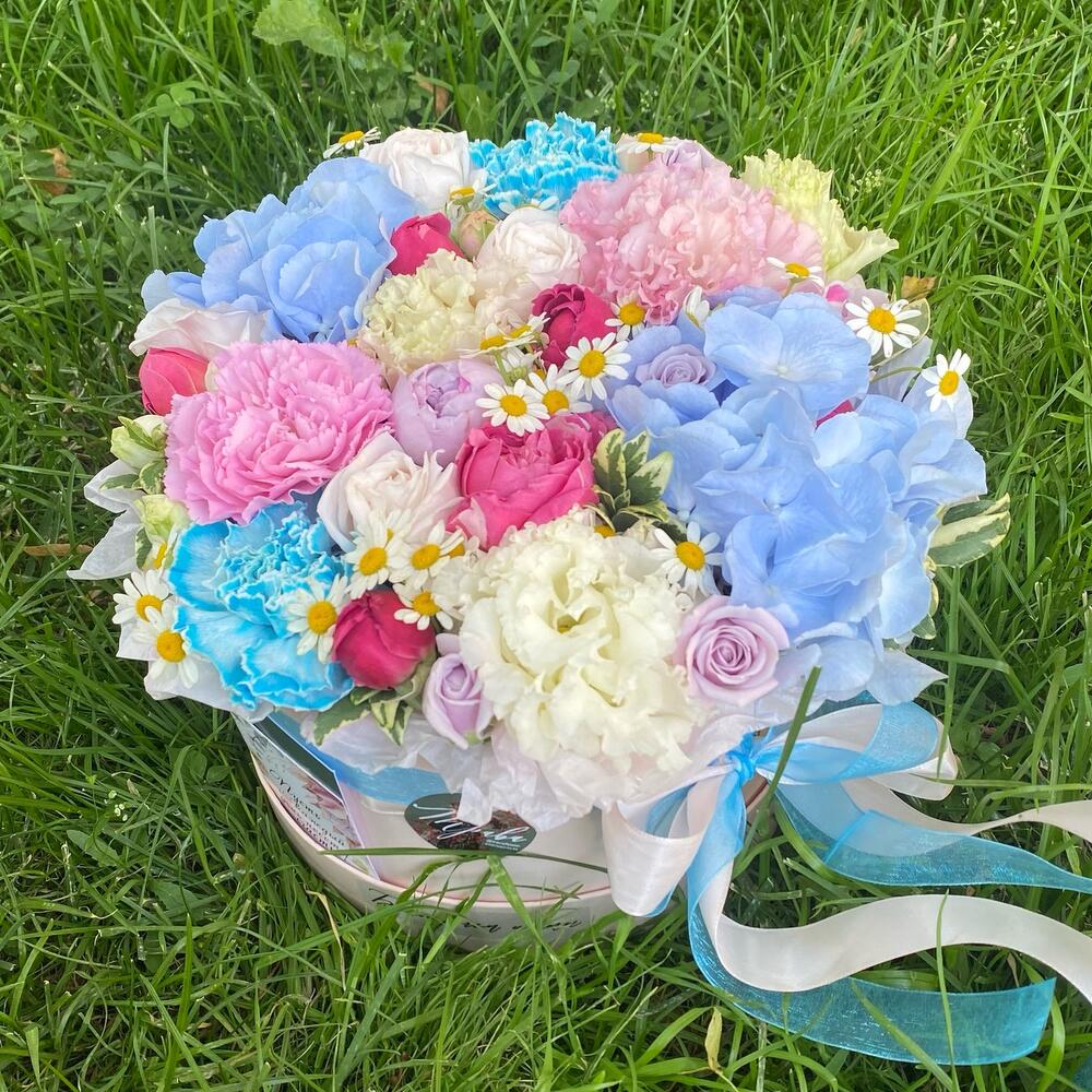 Гортензия - 1 шт. Эустома - 2 шт. Диантус - 4 шт. Коробка - 1 шт. Открыточка с вашими пожеланиями - 1 шт. джульетта кустовая роза пионовидная - 1 шт. лавандер лейс роза кустовая - 2 шт. бомьастик роза - 1 шт.