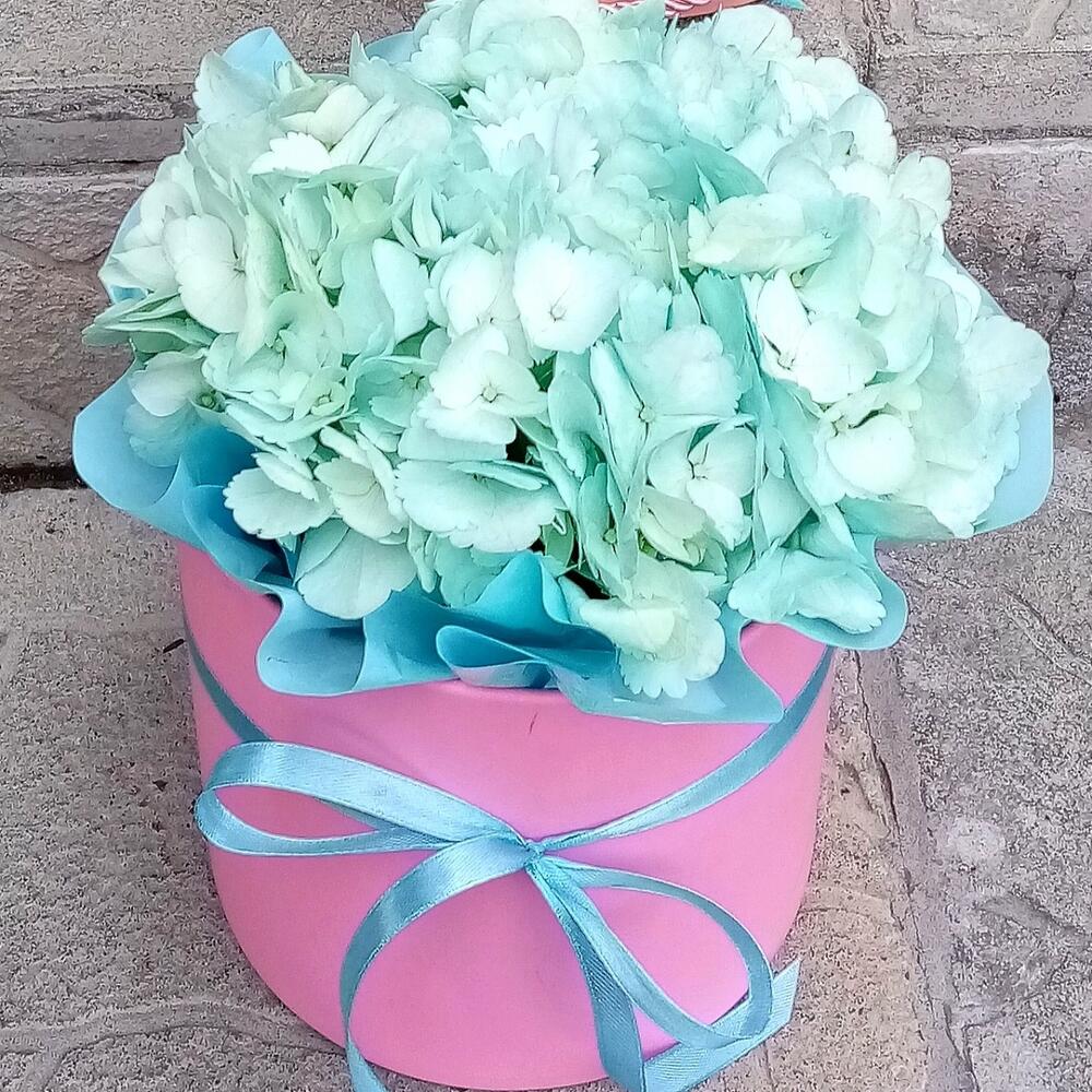 Коробка шляпная - 1 шт. Атласная лента - 1 шт. Пленка матовая - 1 шт. Оазис флористический - 1 шт. гортензия премиум - 1 шт.
