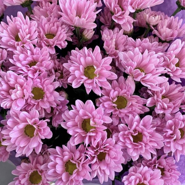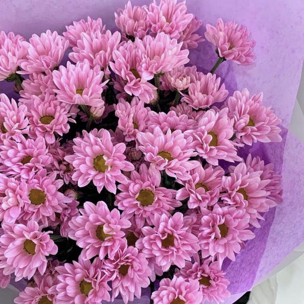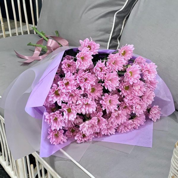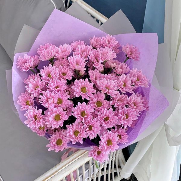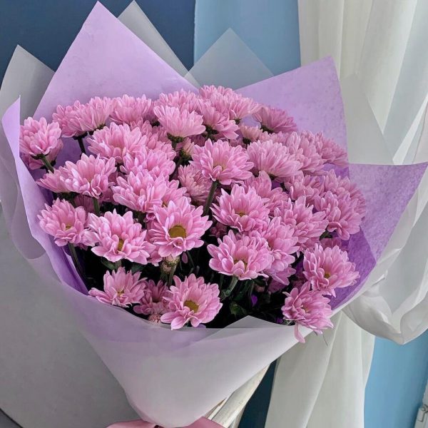Хризантема кустовая – 7 шт. Лента атласная – 2 шт. Упаковка дизайнерская – 2 шт.