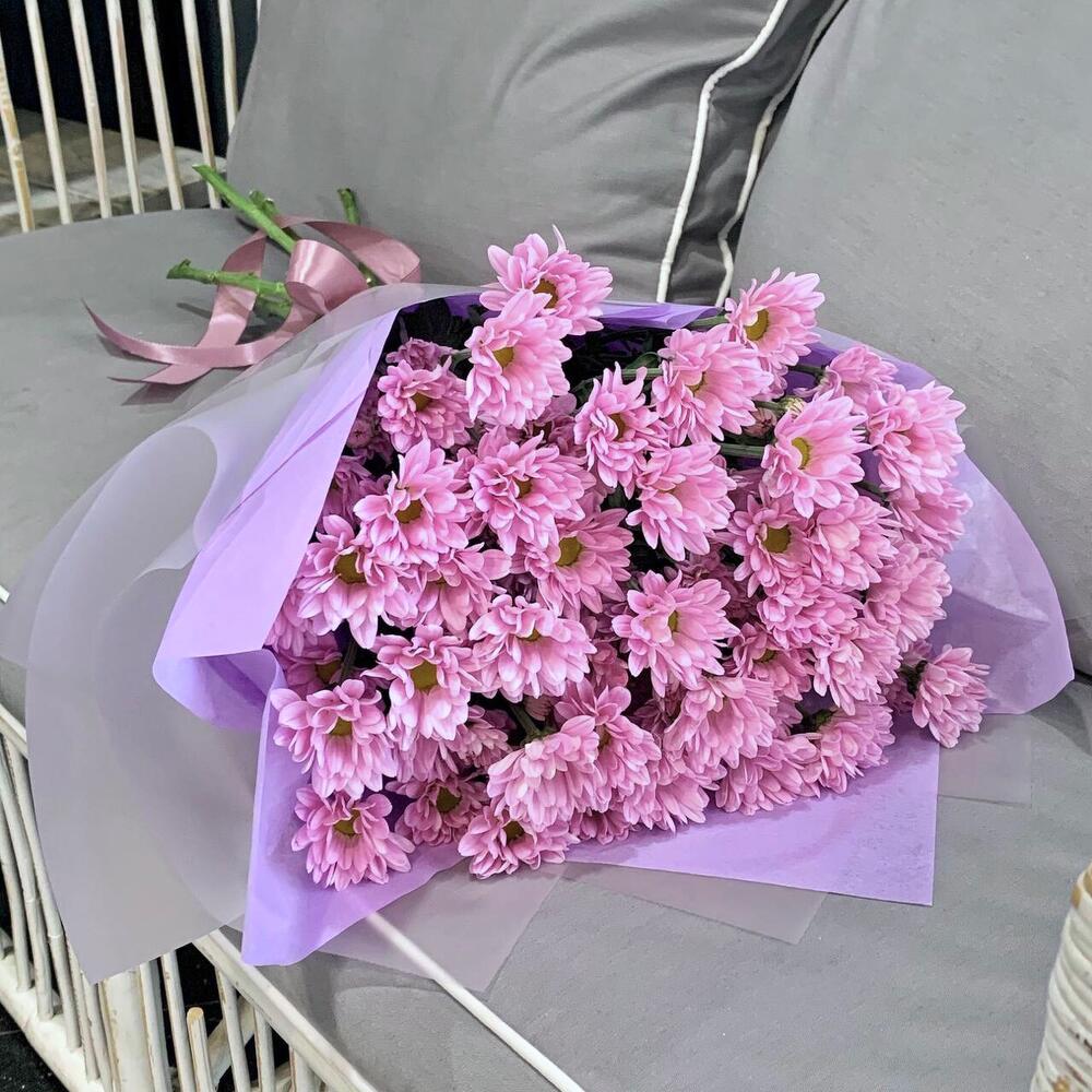 Хризантема кустовая - 7 шт. Лента атласная - 2 шт. Упаковка дизайнерская - 2 шт.