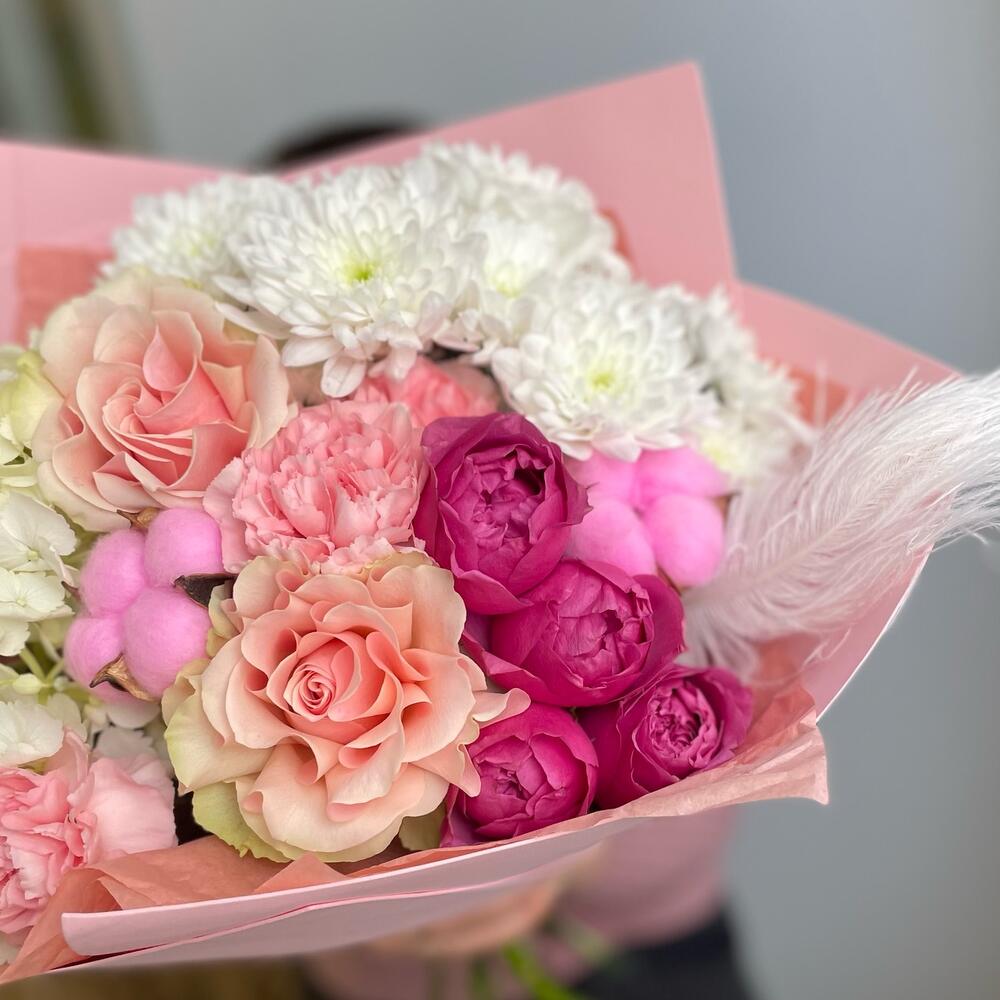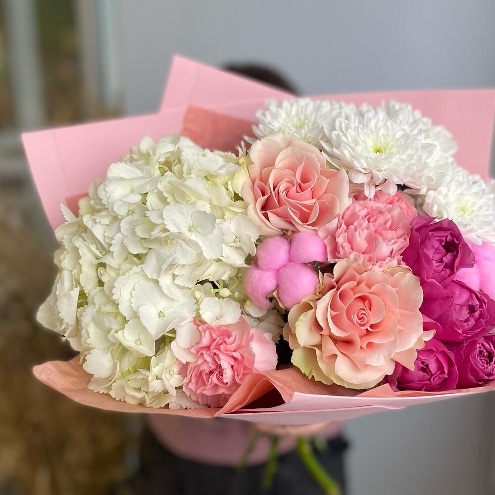 Гортензия - 1 шт. Хлопок - 2 шт. Хризантема кустовая - 1 шт. Роза Софи Лорен - 2 шт. Перо - 1 шт. Диантус сортовой - 3 шт. Мистик баббл - 1 шт. Дизайнерская упаковка - 1 шт.