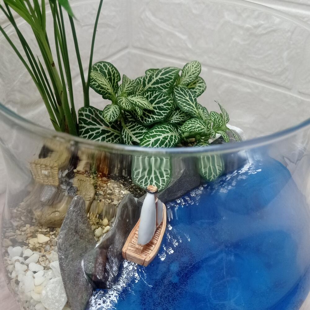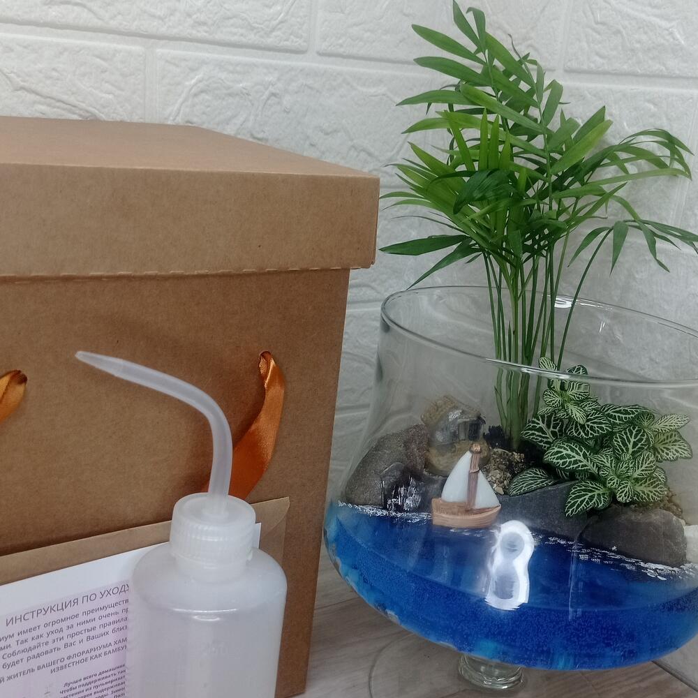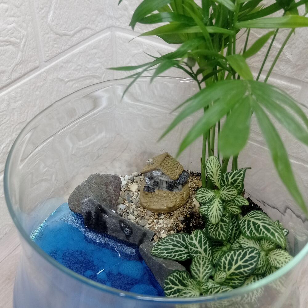 Где-то на китайском острове Шеньшань есть заброшенная рыбацкая деревня Хотуван. Подойти к ней можно пробираясь по узким тропинкам мимо полуразрушенных домов, заросших растительностью. Маленький уголок этого уютного местечка помещен в вазу бренди. Пусть утреннее или вечернее солнце освещает этот островок на вашем подоконнике. В композиции присутствуют Хамедорея и Фиттония, они не любят сквозняков, в этой вазе им уютно и тепло