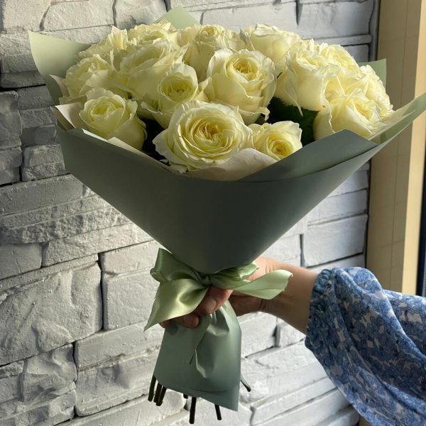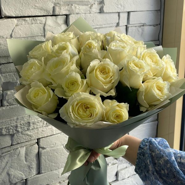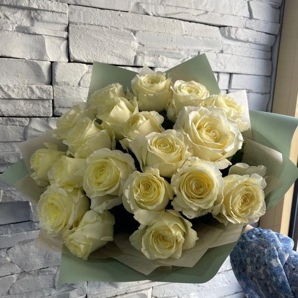 Роза белая – 19 шт. Дизайнерская упаковка – 1 шт.