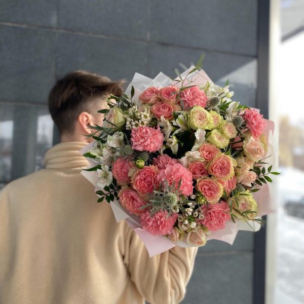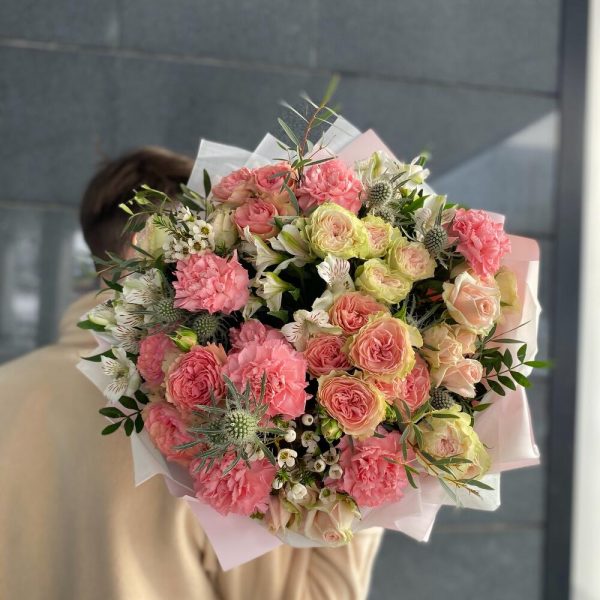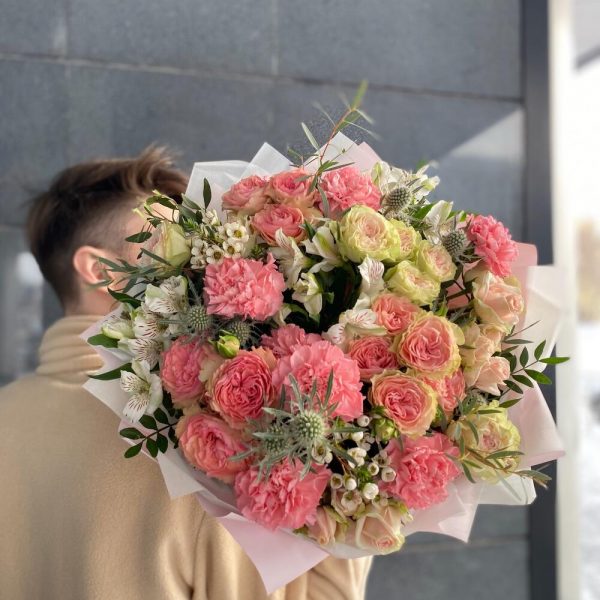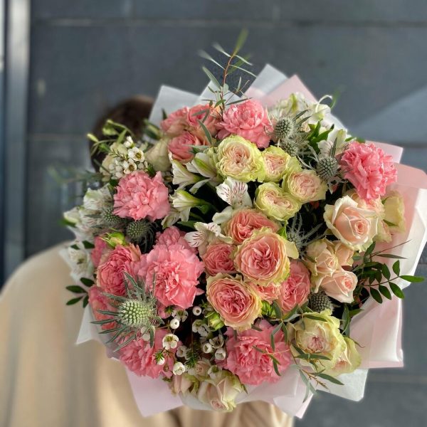 Роза кустовая – 9 шт. Эвкалипт – 2 шт. Гвоздика – 7 шт. Хамелациум – 2 шт.