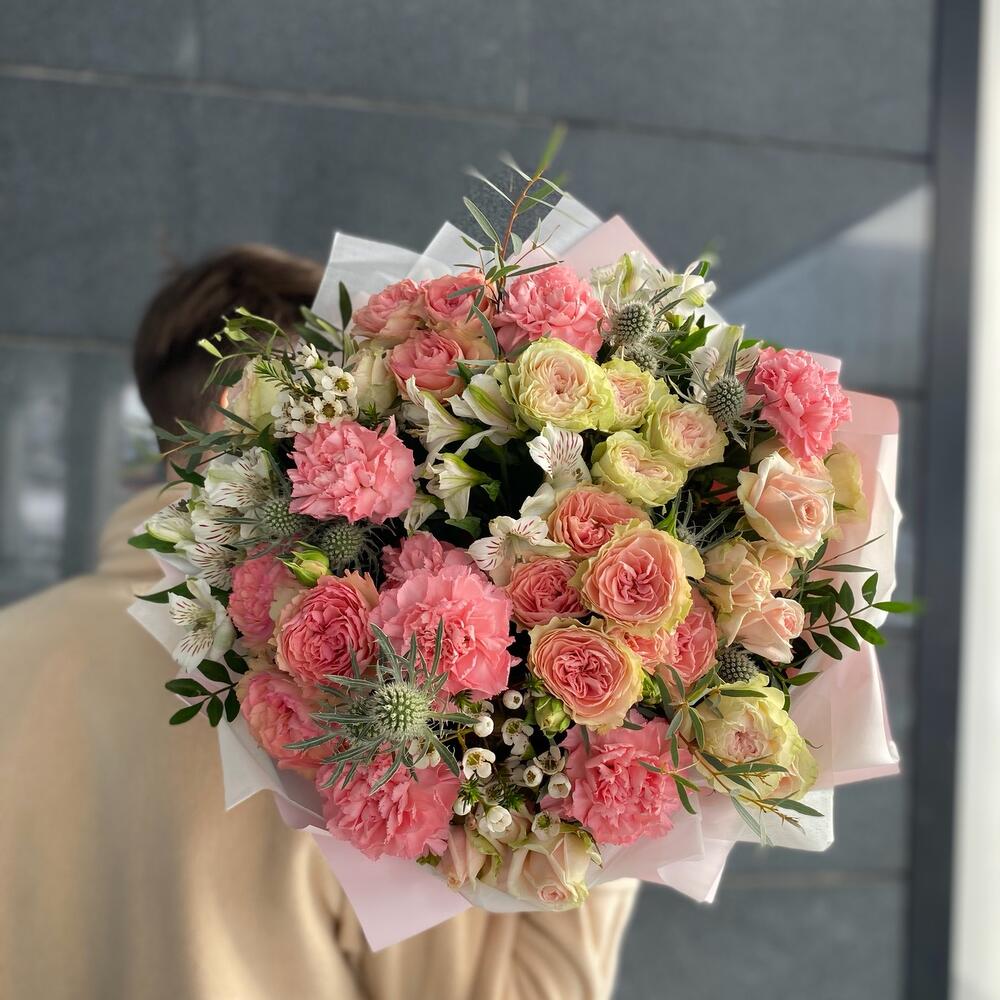 Роза кустовая - 9 шт. Эвкалипт - 2 шт. Гвоздика - 7 шт. Хамелациум - 2 шт.