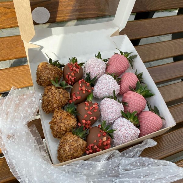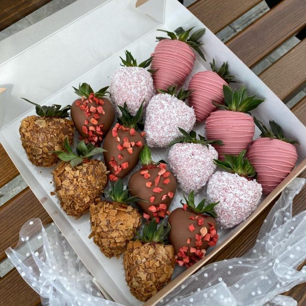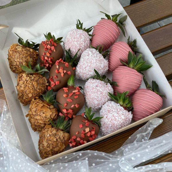 Отборная клубника, бельгийский шоколад молочный и клубничный, вафельная крошка, кокос, сублимированная клубника