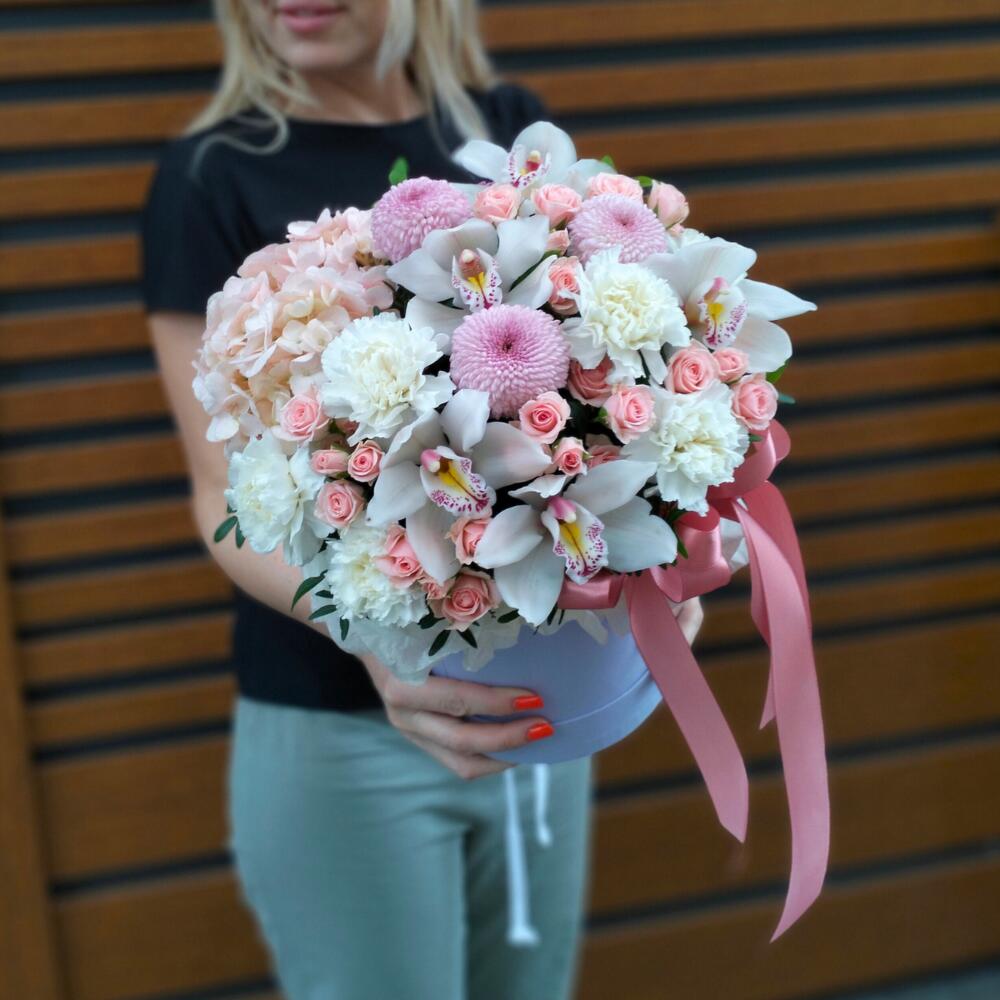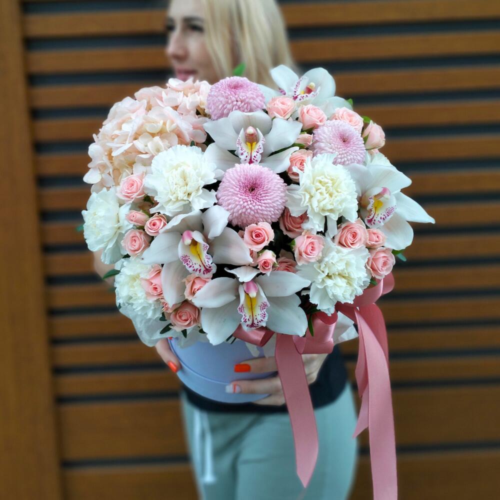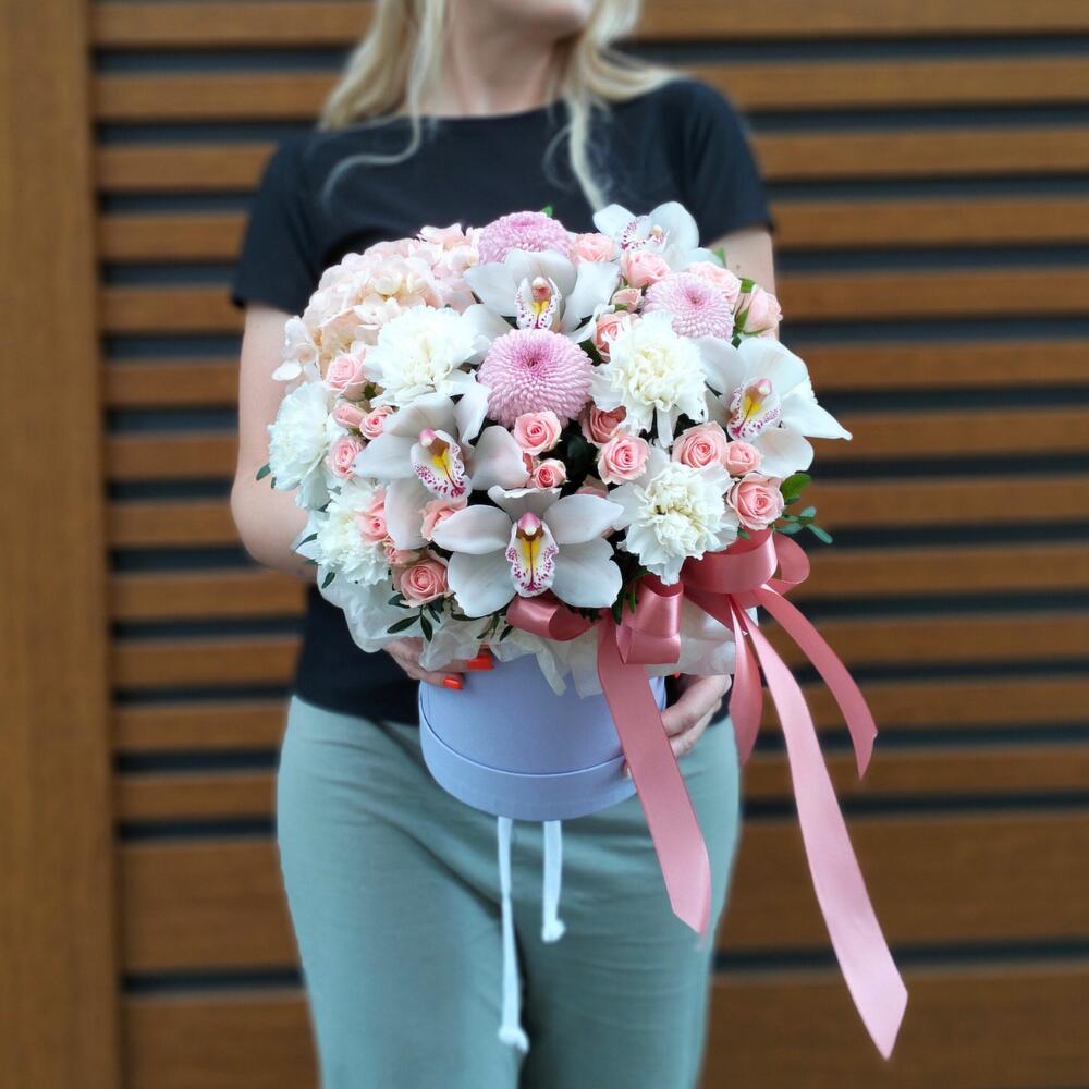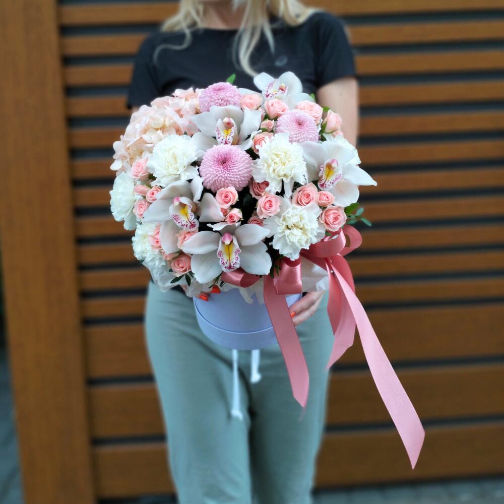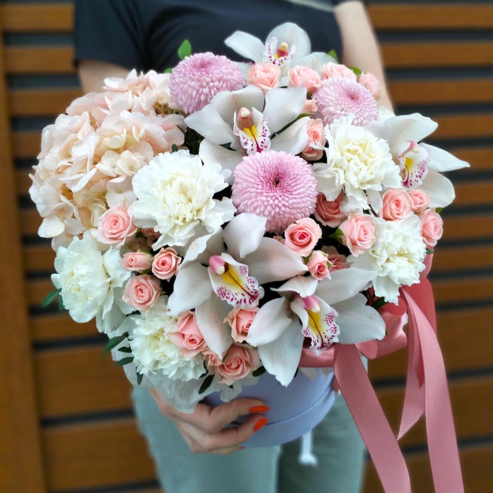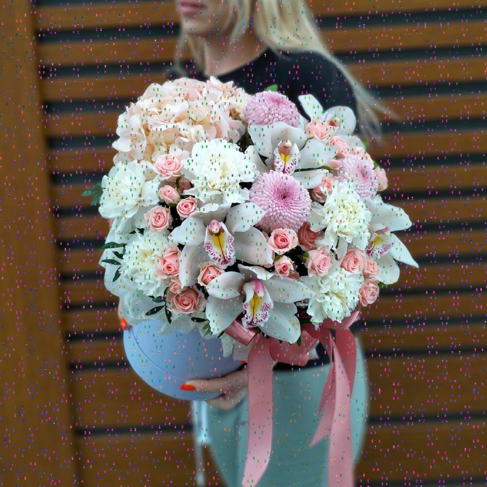 Гортензия - 1 шт. Лента - 2 шт. Орхидея Цимбидиум - 1 шт. Тишью - 1 шт. Оазис - 1 шт. Фисташка - 4 шт. Коробка - 1 шт. Диантус одноголовый - 8 шт. Роза спрей - 6 шт. Удлинители - 5 шт.