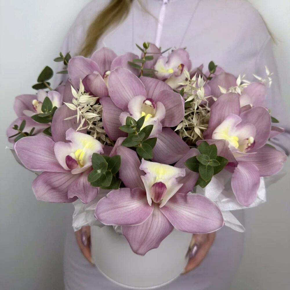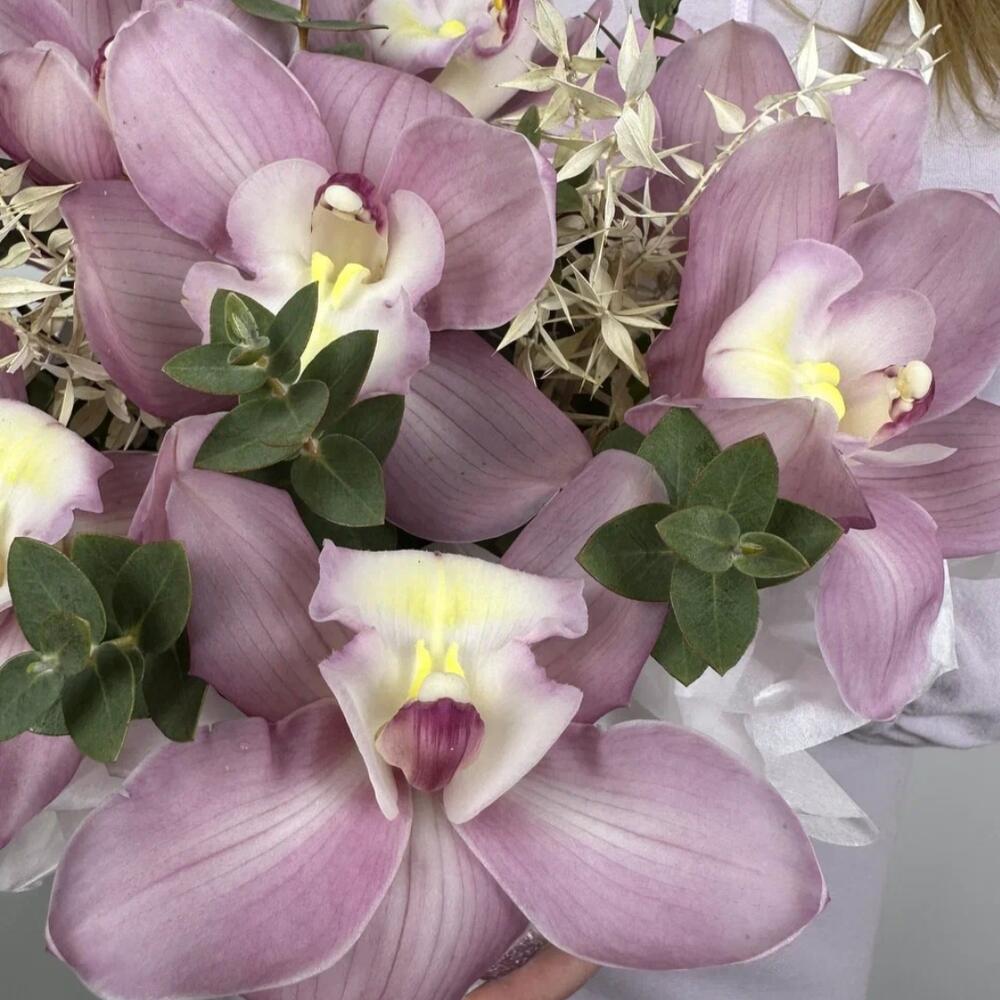 Эвкалипт – 9 шт. Коробка – 1 шт. орхидея – 9 шт. Флористическая губка – 1 шт. рускус стабилизированный – 2 шт.
