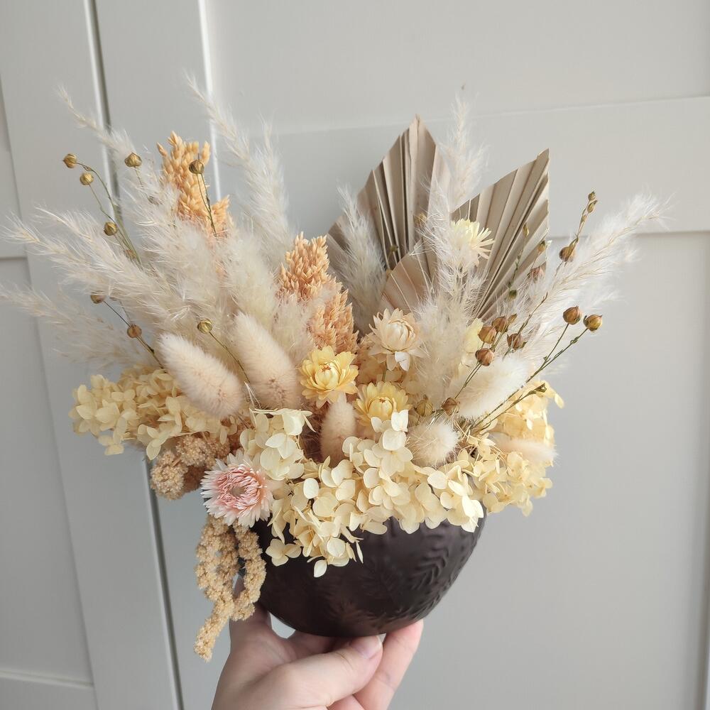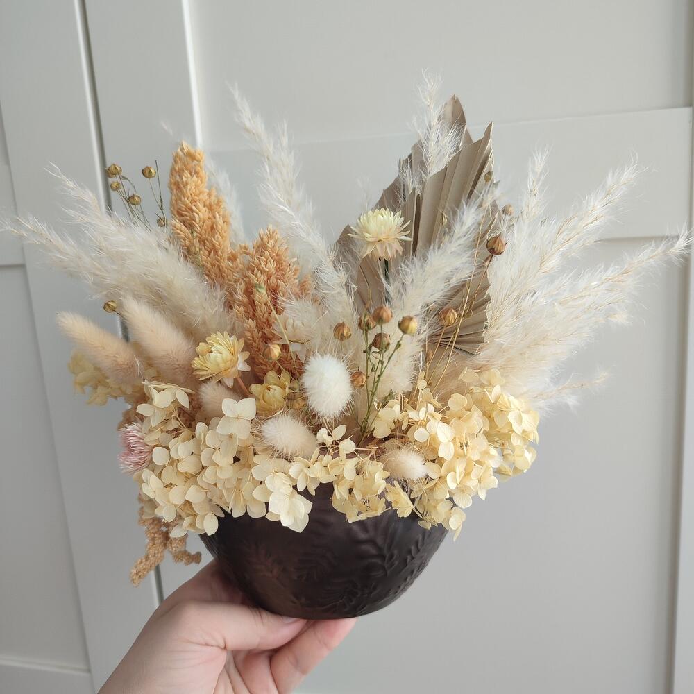 Композиция из сухоцветов в пастельных оттенках, размер всей композиции вместе с кашпо 20см в высоту и 17см в ширину. Композиция собрана в бирюзовом керамическом кашпо размером 15х9см.В составе композиции используются натуральные и стабилизированные сухоцветы. Композиция отлично впишется в любой интерьер. Срок годности не ограничен. Главные правила : не ставить на яркое солнышко, что бы не выгорела и переодически убирать пыль, встряхнув композицию над раковиной. Доставляется в подарочной крафтовой упаковке, с инструкцией по уходу.
