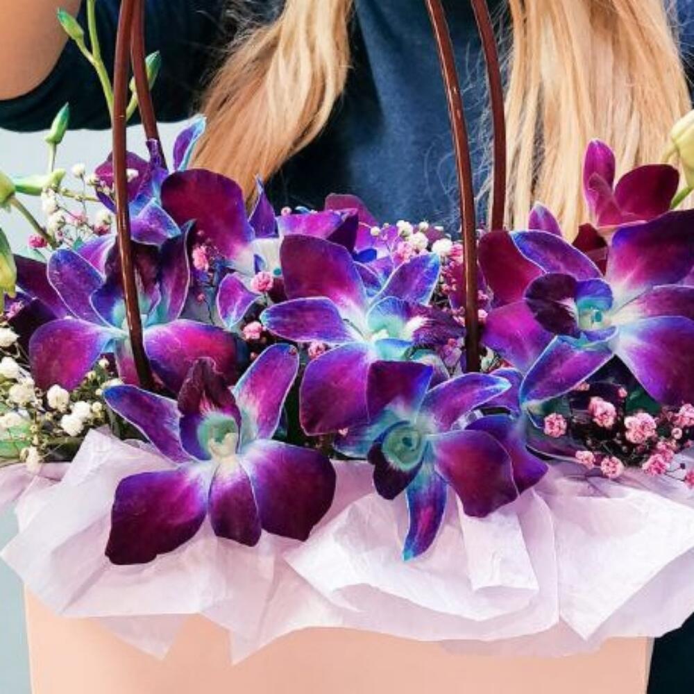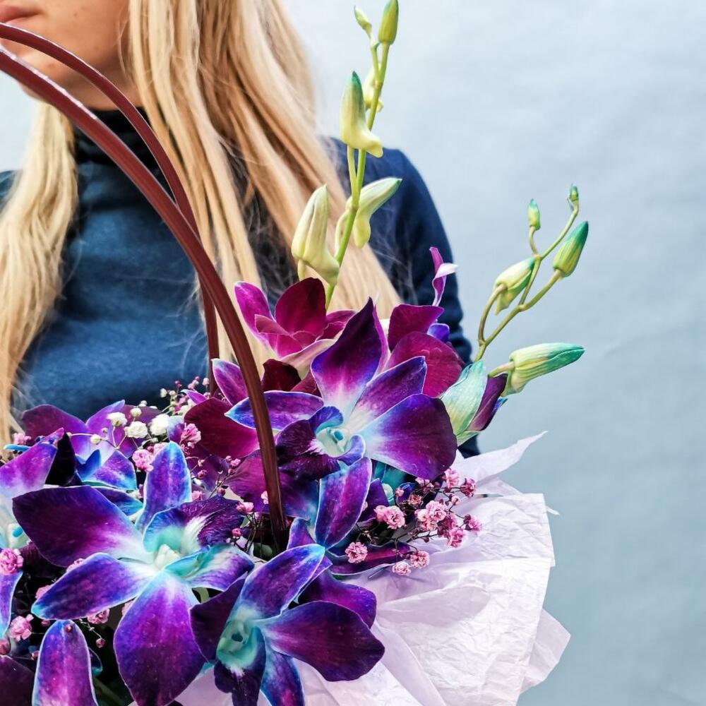 Гипсофила – 2 шт. Оазис – 1 шт. Сумочка – 1 шт. Дендробиум – 5 шт. Бумага тишью – 1 шт.