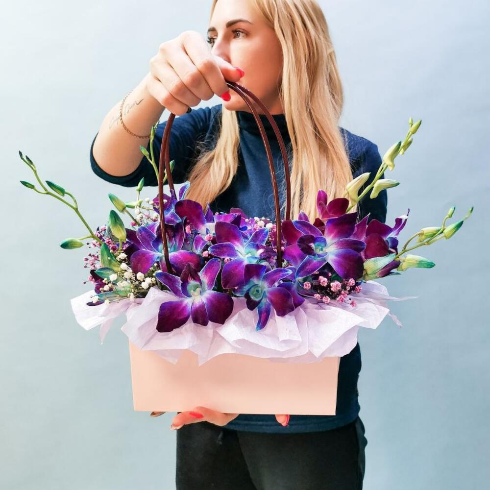 Гипсофила - 2 шт. Оазис - 1 шт. Сумочка - 1 шт. Дендробиум - 5 шт. Бумага тишью - 1 шт.