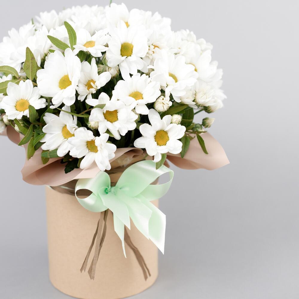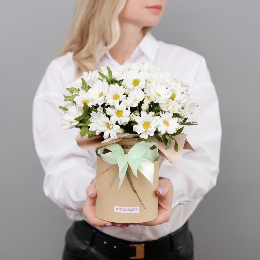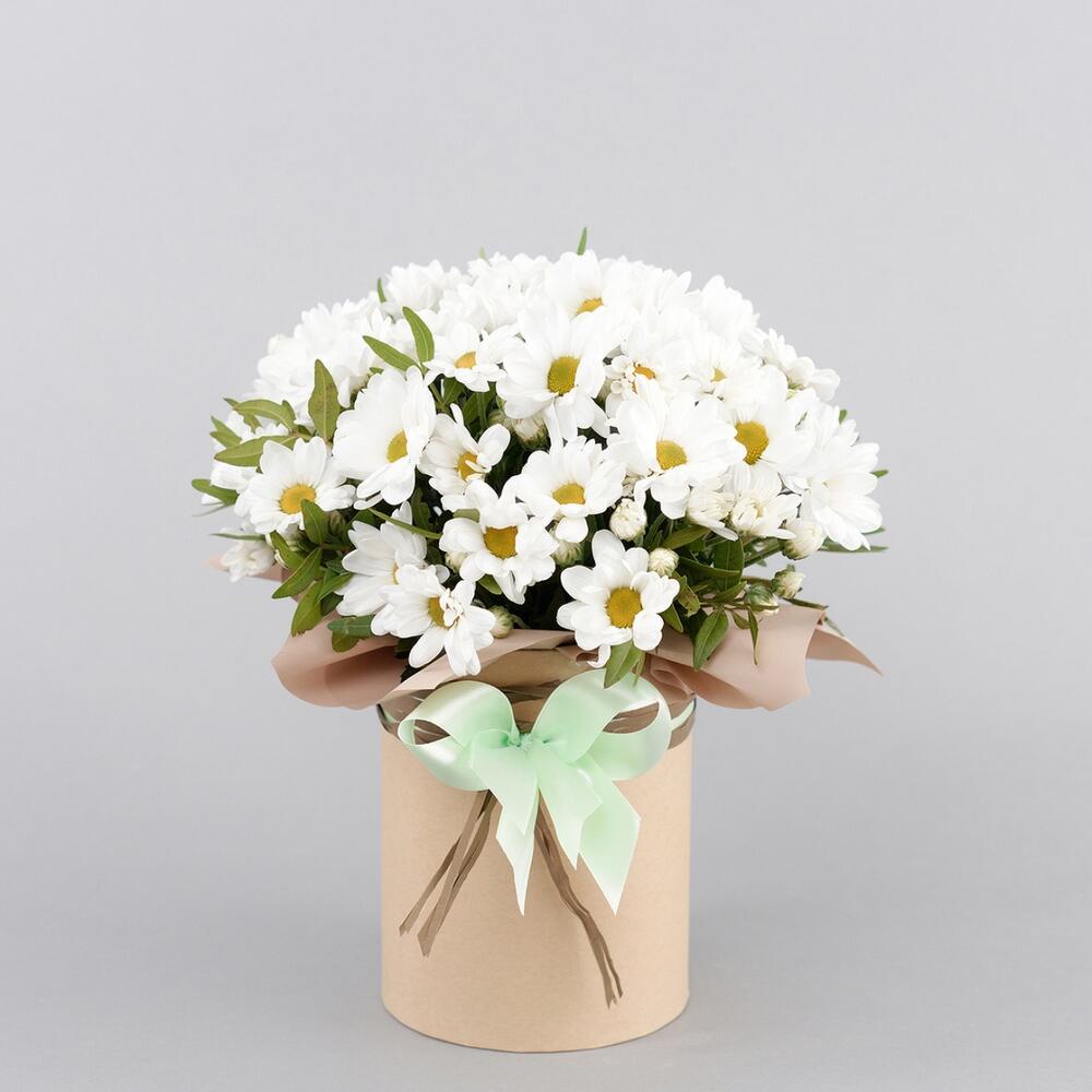 Лента - 2 шт. Хризантема кустовая - 5 шт. Пленка - 1 шт. Оазис - 1 шт. Фисташка - 2 шт. Шляпная коробка - 1 шт.