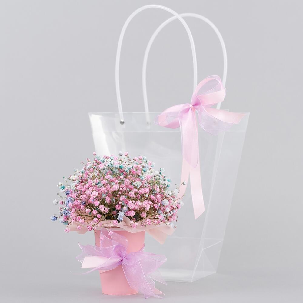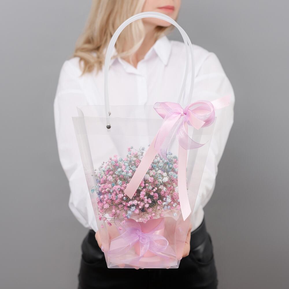 Композиция радужной гипсофилы в сумочке