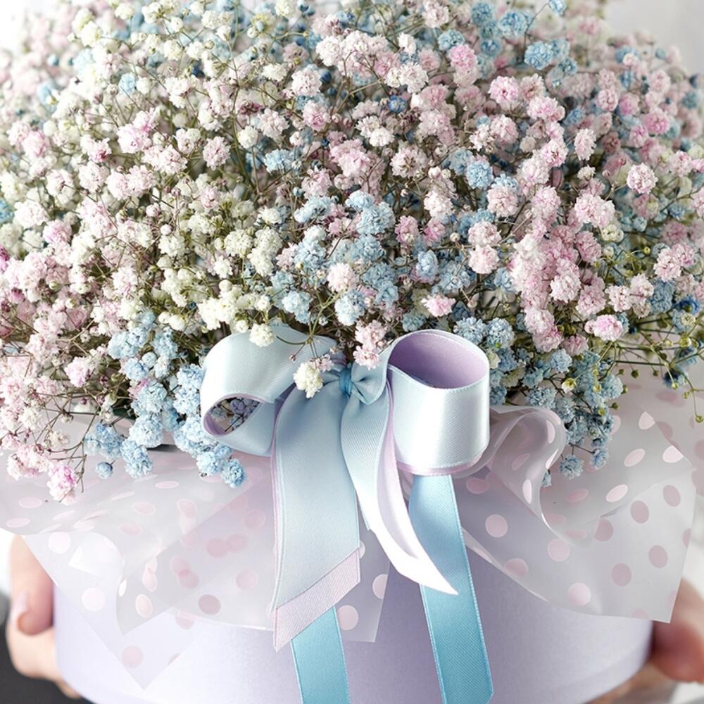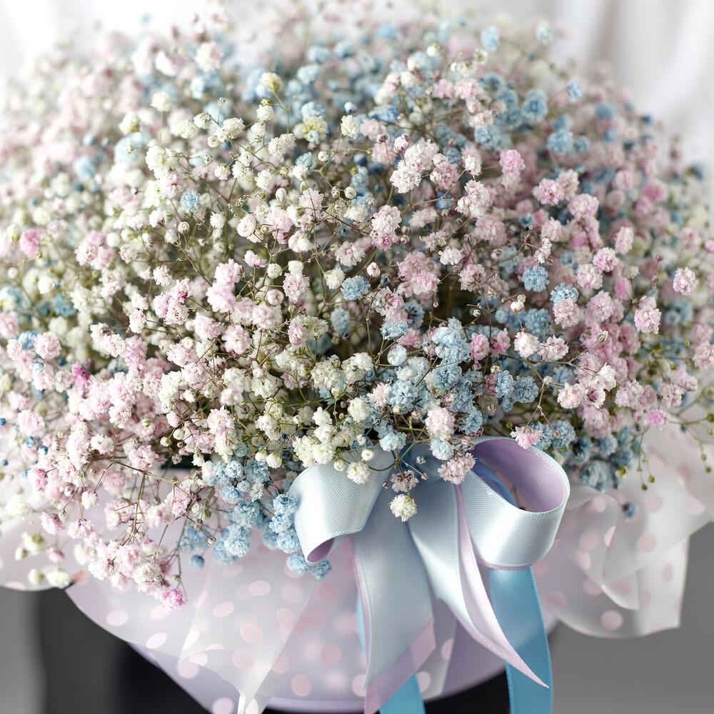 Гипсофила – 9 шт. Лента атласная – 2 шт. Шляпная коробка – 1 шт. Пленка матовая – 1 шт. Оазис флористический – 1 шт.