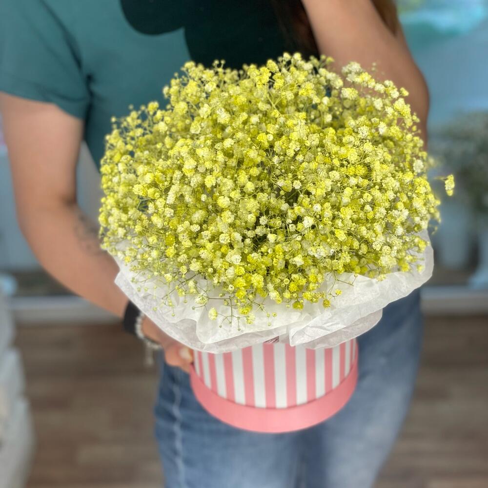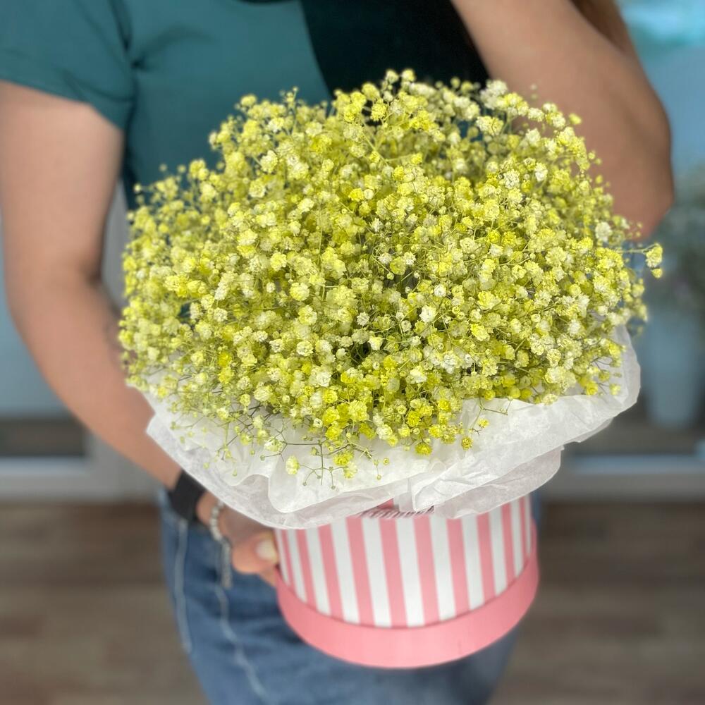 Гипсофила - 6 шт. Коробка дизайнерская - 1 шт. Оазис флористический - 1 шт. Бумага тишью - 1 шт. улыбка для вас :) - 1 шт.