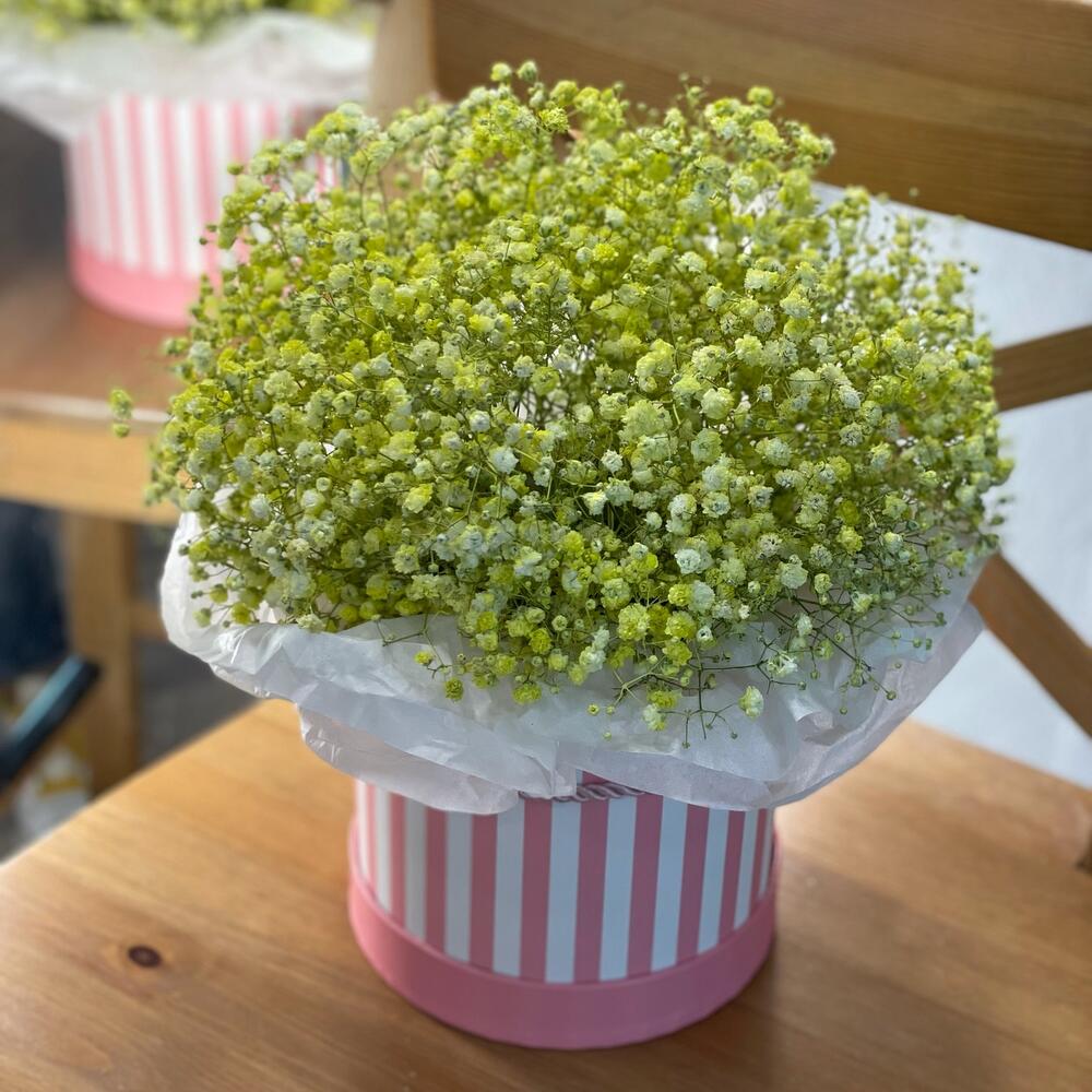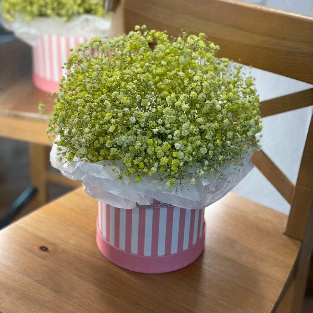 Гипсофила – 6 шт. Коробка дизайнерская – 1 шт. Оазис флористический – 1 шт. Бумага тишью – 1 шт. улыбка для вас 🙂 – 1 шт.