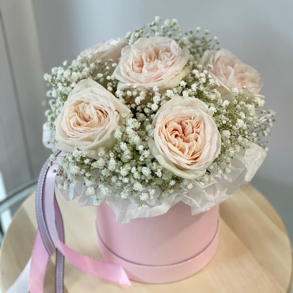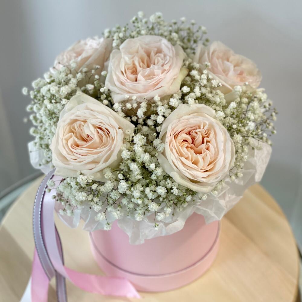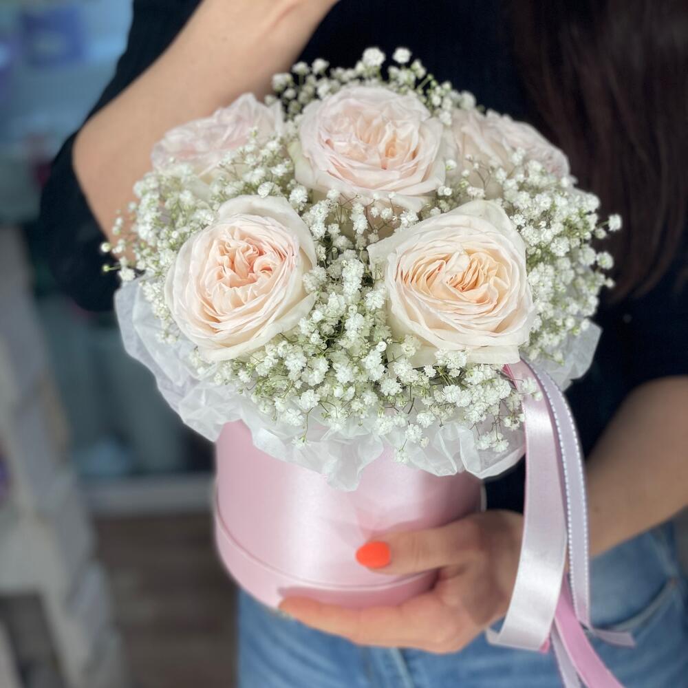 Гипсофила - 3 шт. Лента атласная - 1 шт. Коробка шляпная - 1 шт. Роза пионовидная - 5 шт. Оазис флористический - 1 шт.