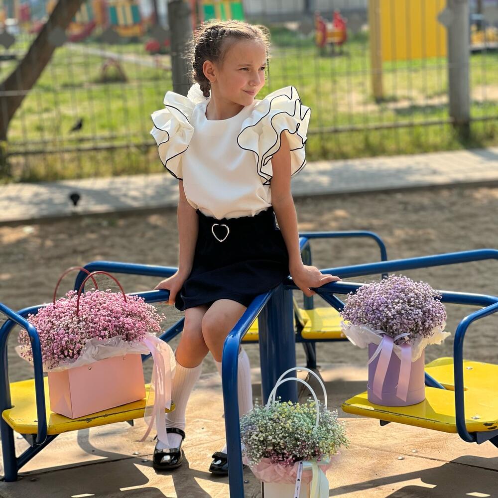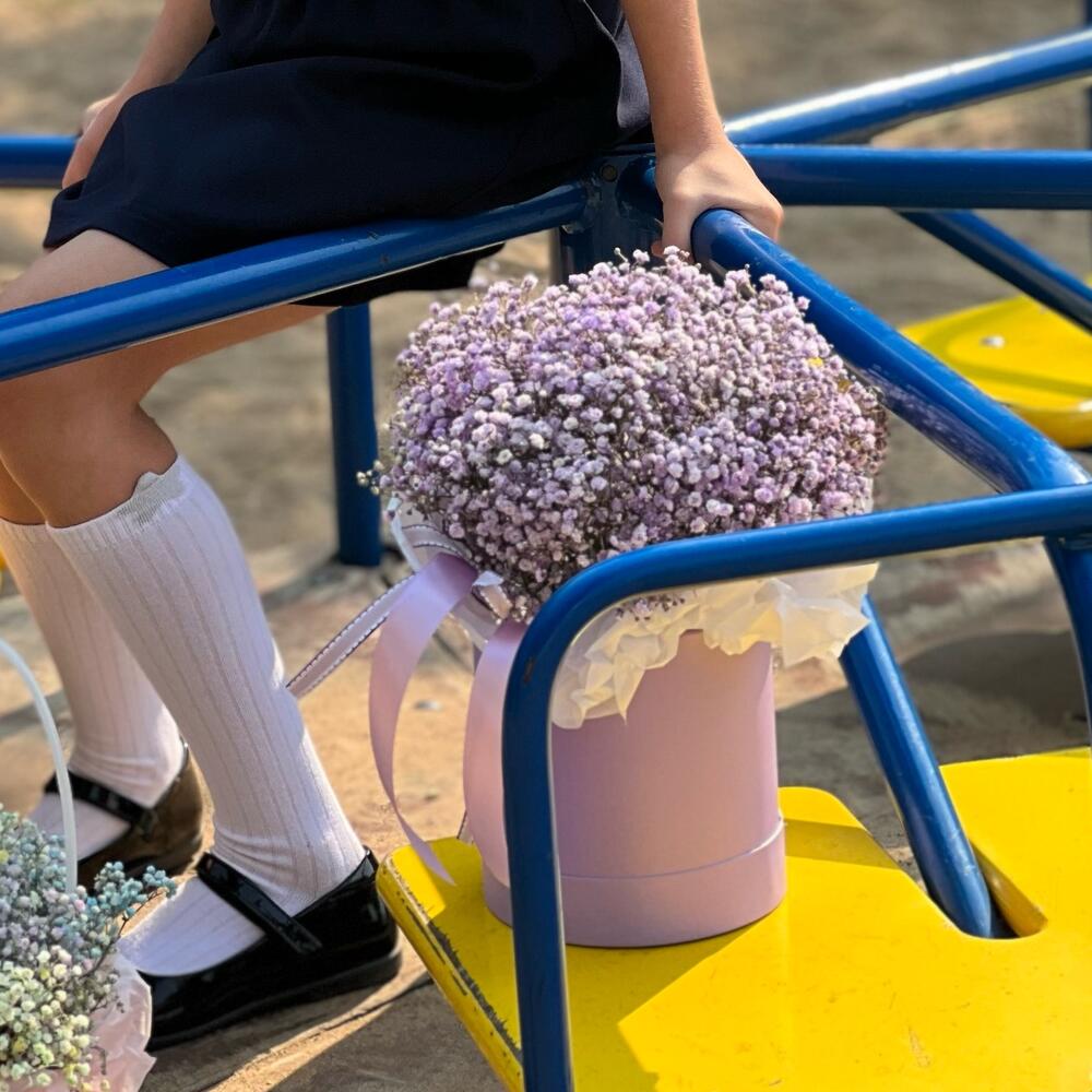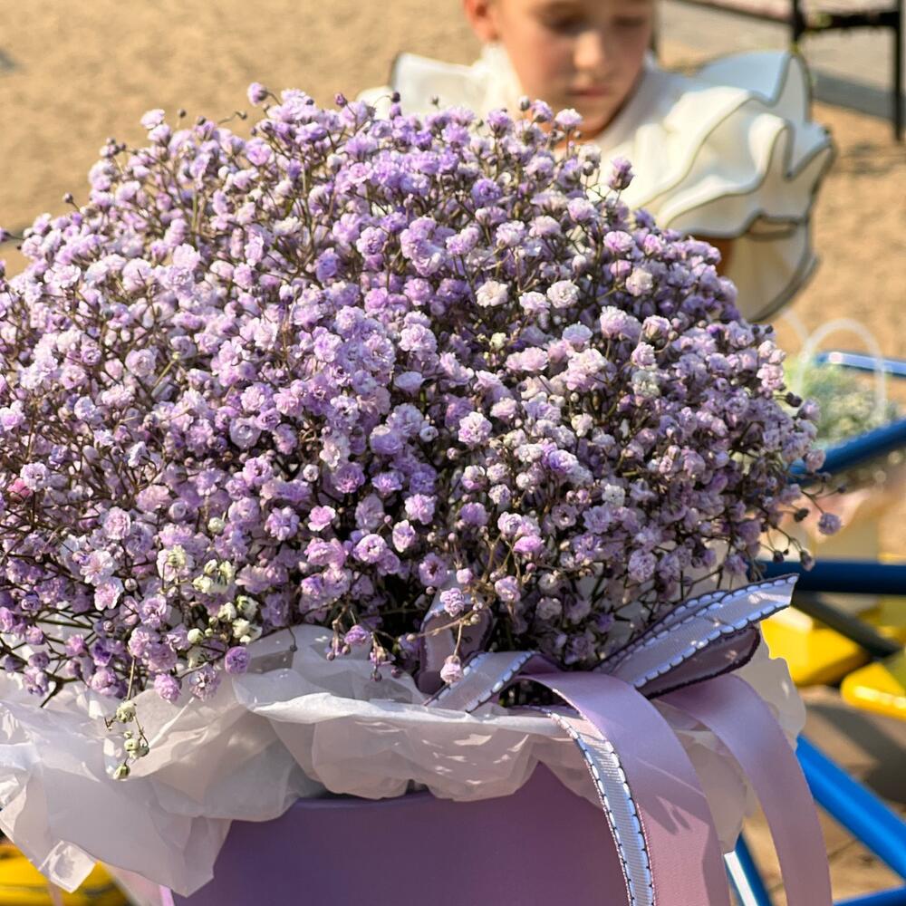 Гипсофила – 5 шт. Лента атласная – 2 шт. Коробка – 1 шт. Оазис флористический – 1 шт.