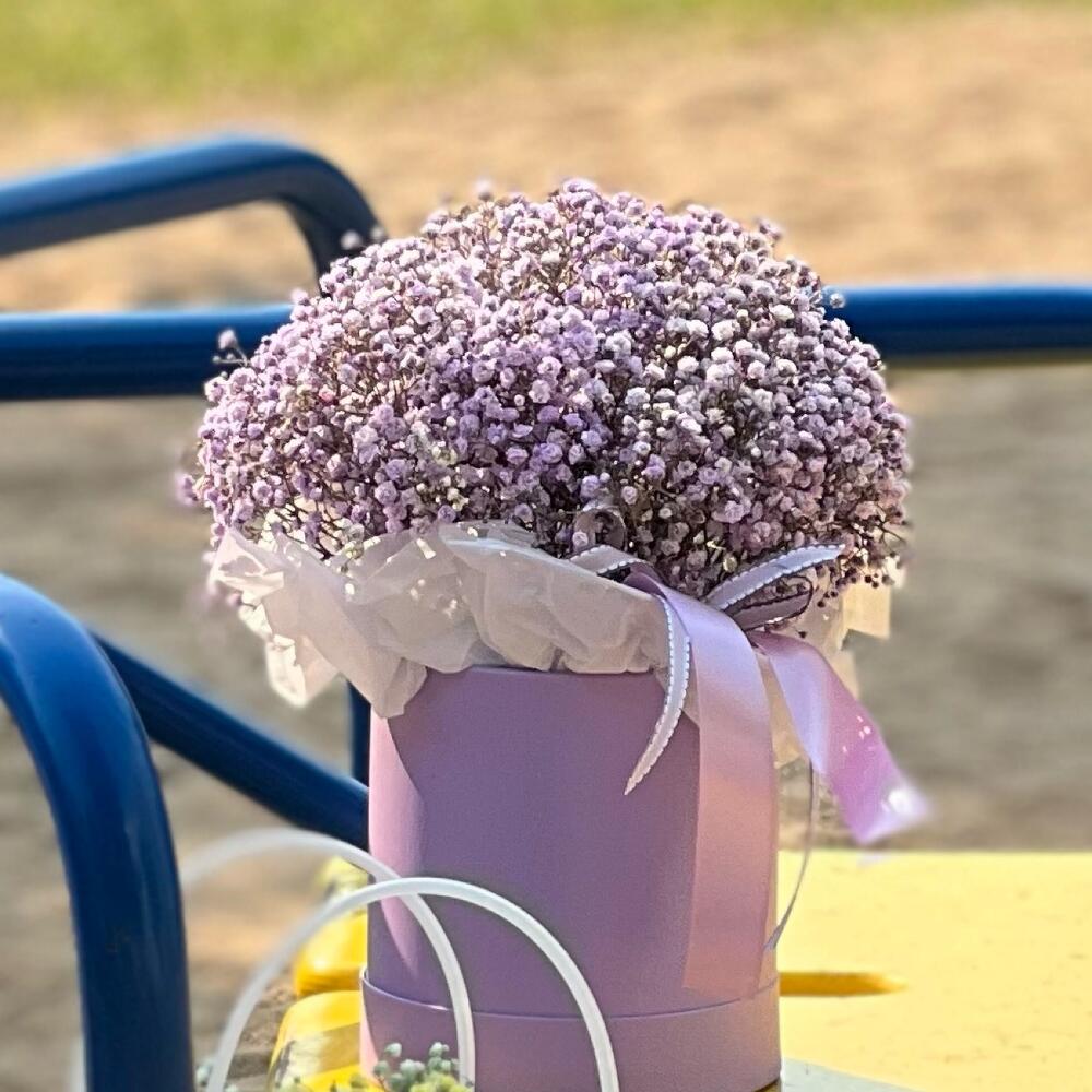 Гипсофила - 5 шт. Лента атласная - 2 шт. Коробка - 1 шт. Оазис флористический - 1 шт.