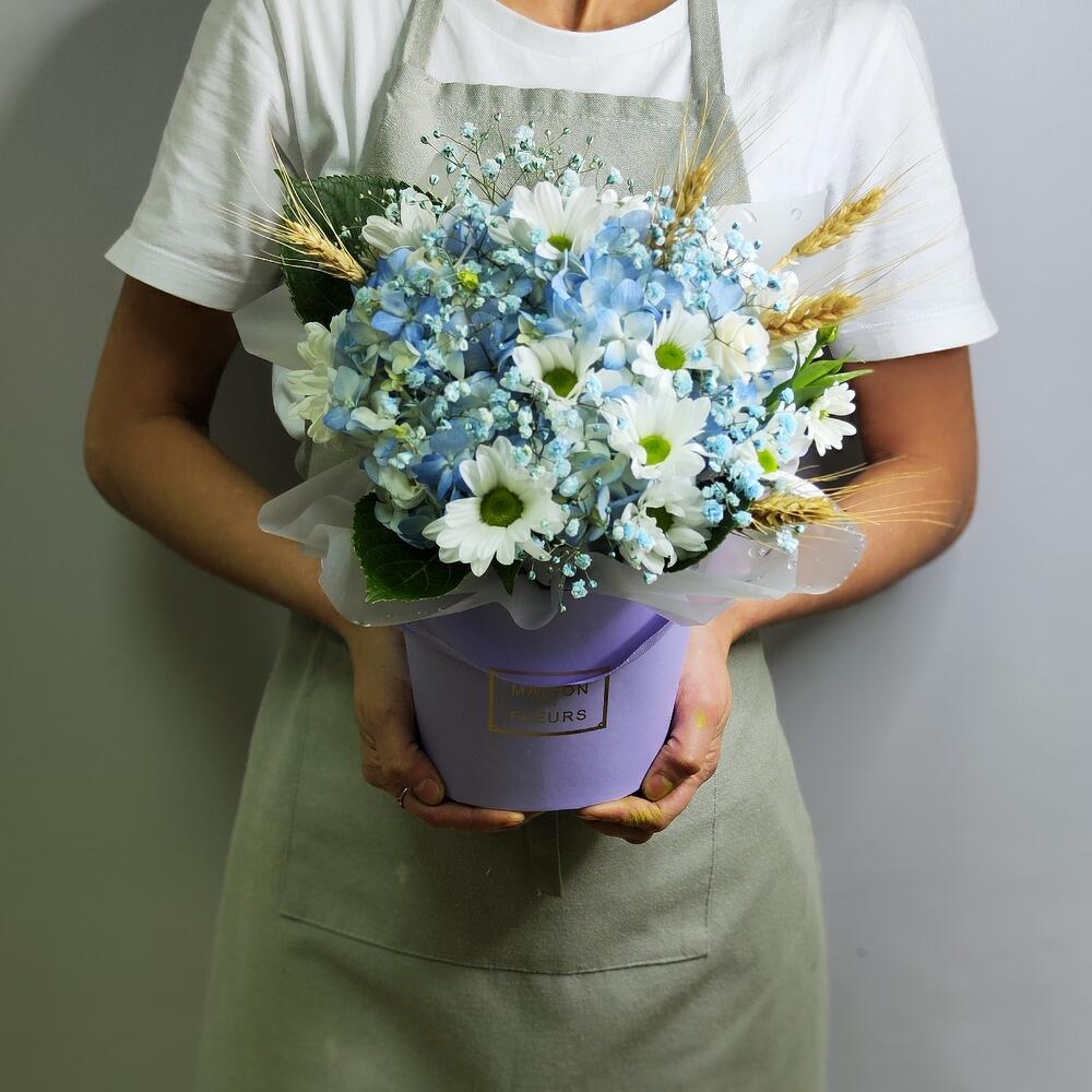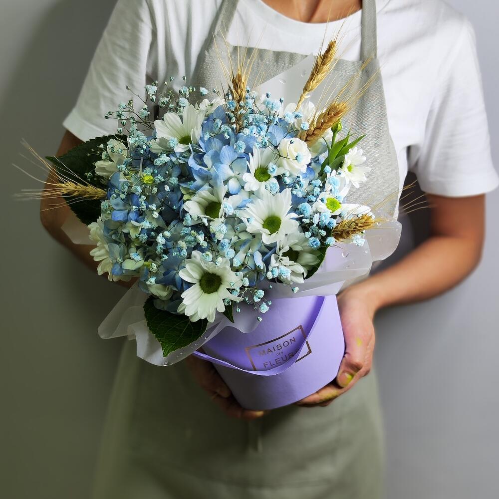 Колосья пшеницы – 5 шт. Хризантема кустовая ромашковая – 2 шт. Гортензия голубая – 1 шт. Пленка матовая – 1 шт. Лизиантус Алиса белый – 1 шт. Гипсофила голубая – 1 шт. кашпо сиреневое – 1 шт.