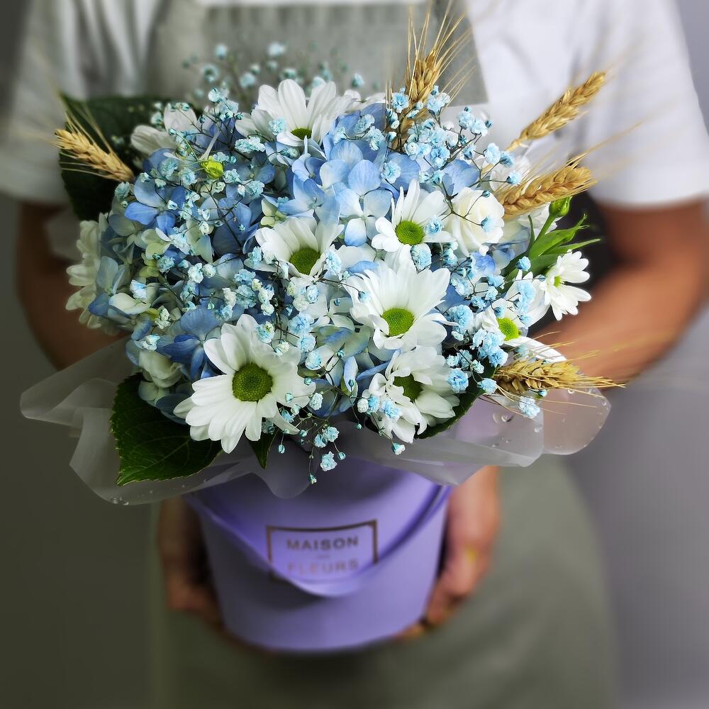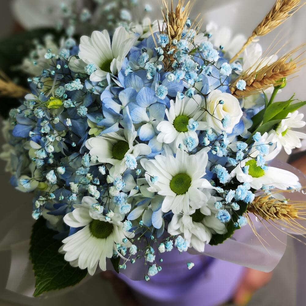 Колосья пшеницы - 5 шт. Хризантема кустовая ромашковая - 2 шт. Гортензия голубая - 1 шт. Пленка матовая - 1 шт. Лизиантус Алиса белый - 1 шт. Гипсофила голубая - 1 шт. кашпо сиреневое - 1 шт.