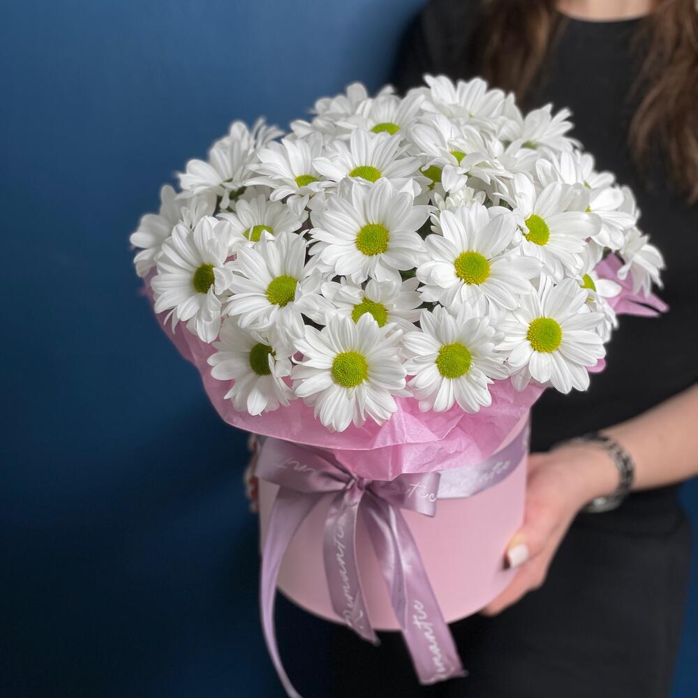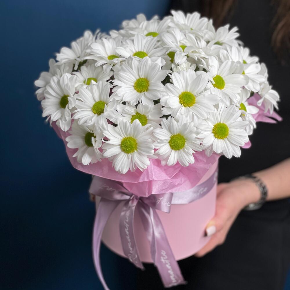 Хризантема кустовая - 5 шт. Лента атласная - 1 шт. Коробка - 1 шт. Оазис флористический - 1 шт. Бумага тишью - 1 шт.