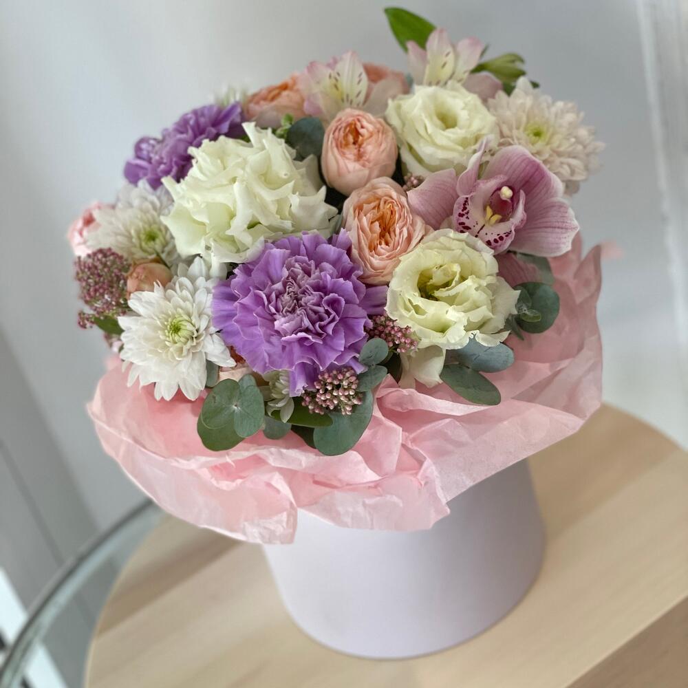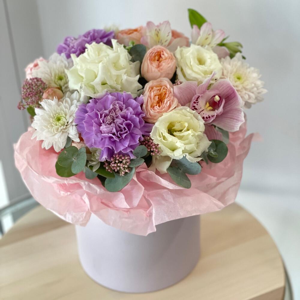 Альстромерия - 1 шт. Озотамнус - 1 шт. Орхидея Цимбидиум - 1 шт. Хризантема кустовая - 1 шт. Эвкалипт - 1 шт. Роза пионовидная кустовая - 1 шт. Коробка - 1 шт. Лунная гвоздика - 2 шт. Лизиантус Алиса белый - 1 шт. Оазис флористический - 1 шт. Бумага тишью - 1 шт.