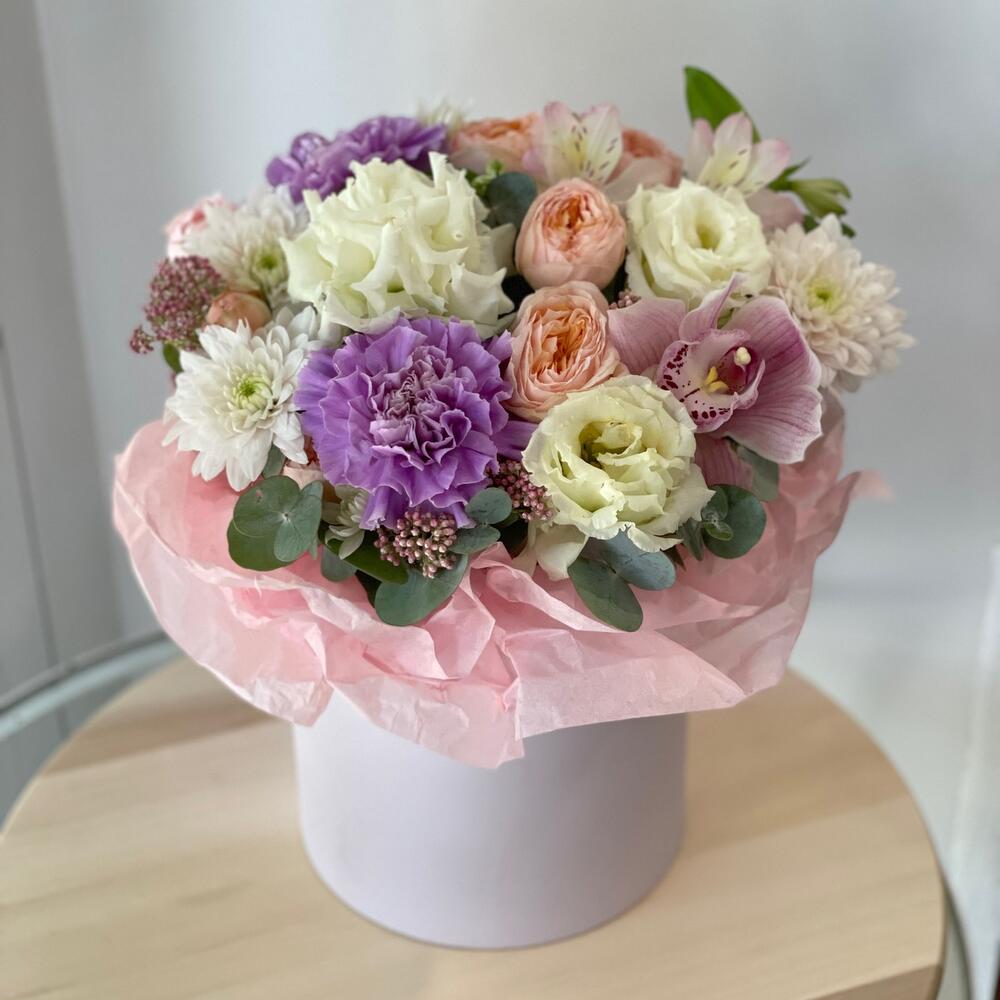 Альстромерия – 1 шт. Озотамнус – 1 шт. Орхидея Цимбидиум – 1 шт. Хризантема кустовая – 1 шт. Эвкалипт – 1 шт. Роза пионовидная кустовая – 1 шт. Коробка – 1 шт. Лунная гвоздика – 2 шт. Лизиантус Алиса белый – 1 шт. Оазис флористический – 1 шт. Бумага тишью – 1 шт.