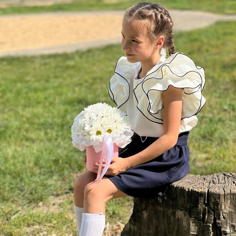 Лента атласная – 3 шт. Хризантема кустовая белая – 3 шт. Коробка – 1 шт. Оазис флористический – 1 шт. Бумага тишью – 1 шт.