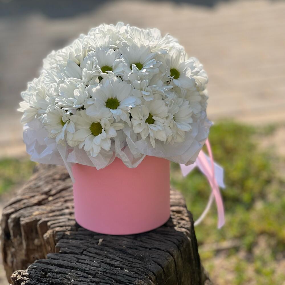 Лента атласная - 3 шт. Хризантема кустовая белая - 3 шт. Коробка - 1 шт. Оазис флористический - 1 шт. Бумага тишью - 1 шт.