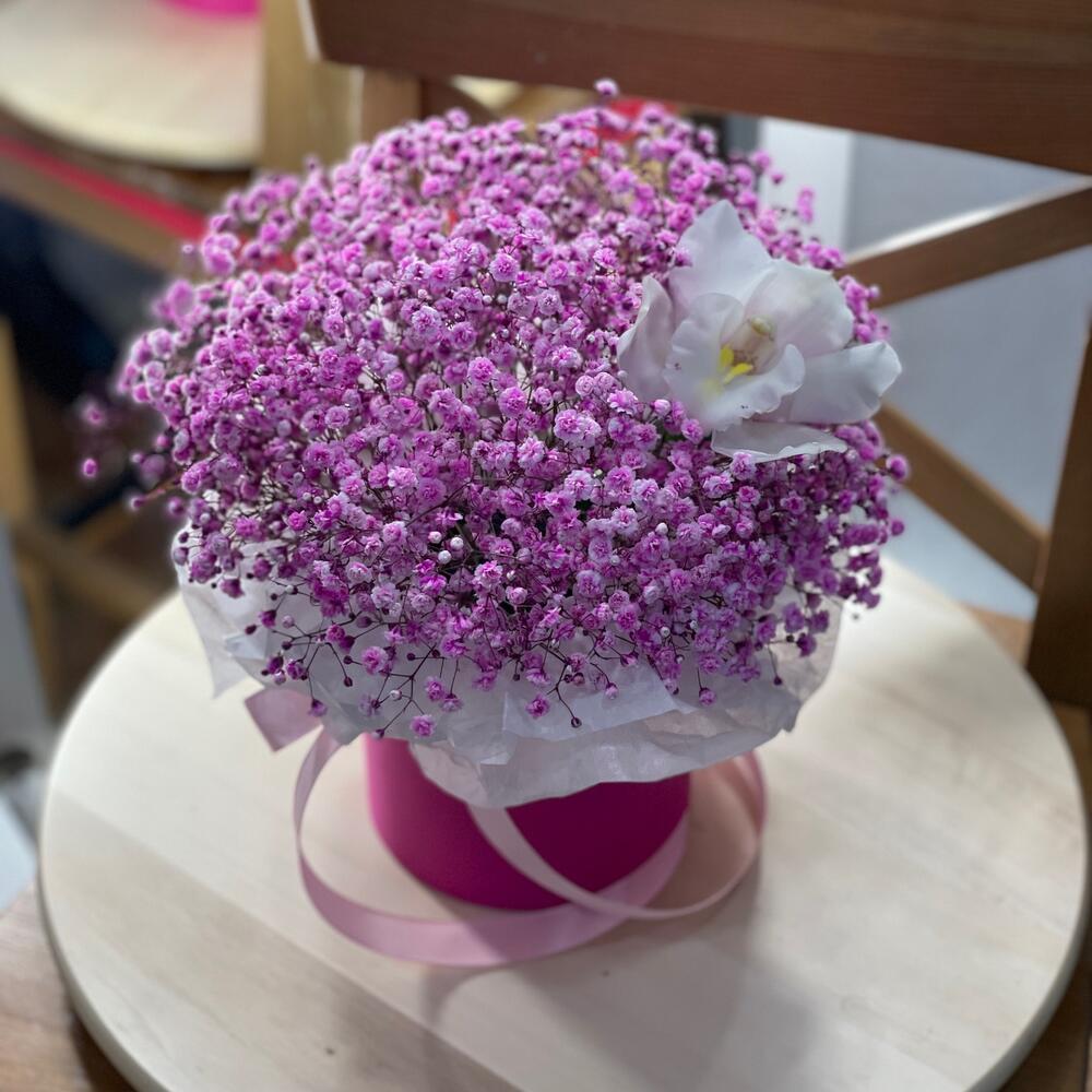 Гипсофила - 4 шт. Орхидея Цимбидиум - 1 шт. Коробка - 1 шт. Оазис флористический - 1 шт. Бумага тишью - 1 шт.