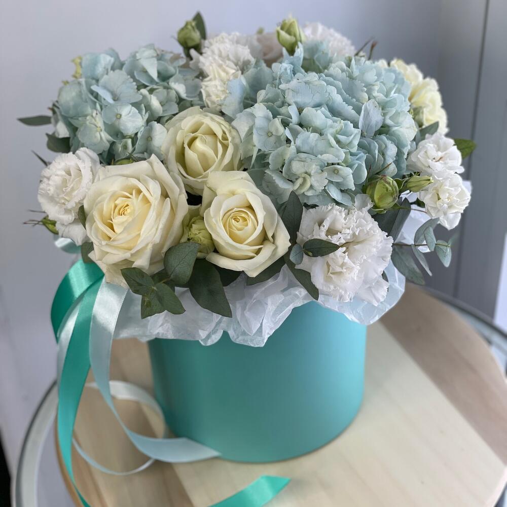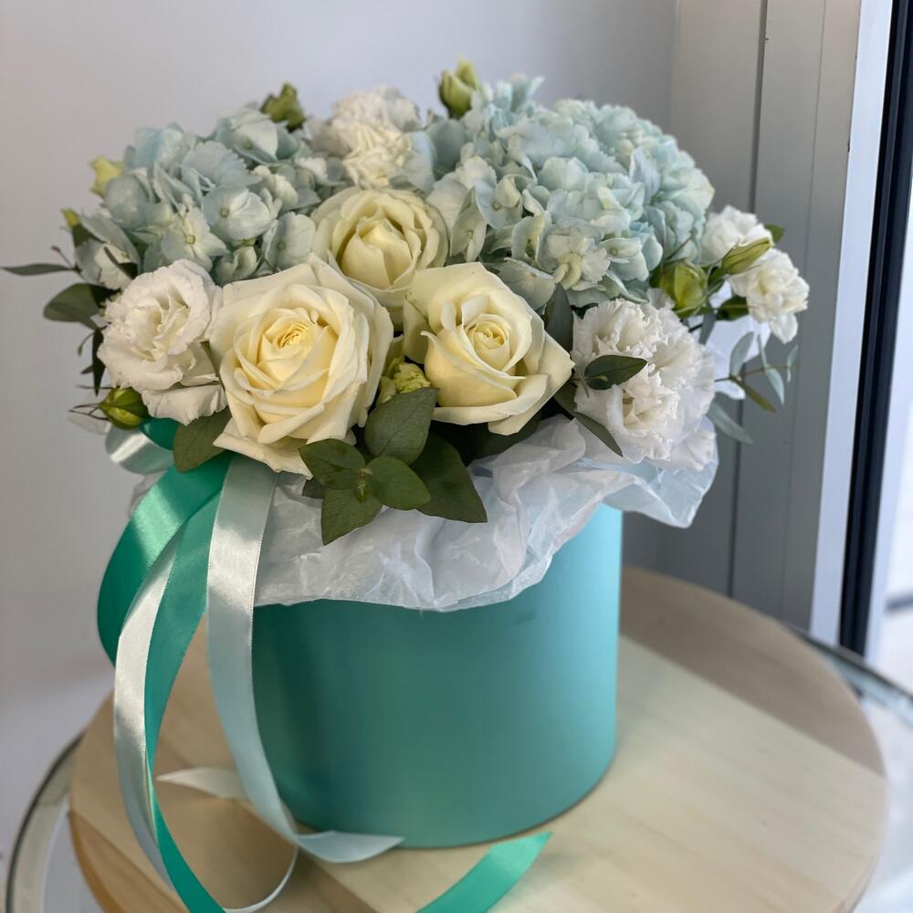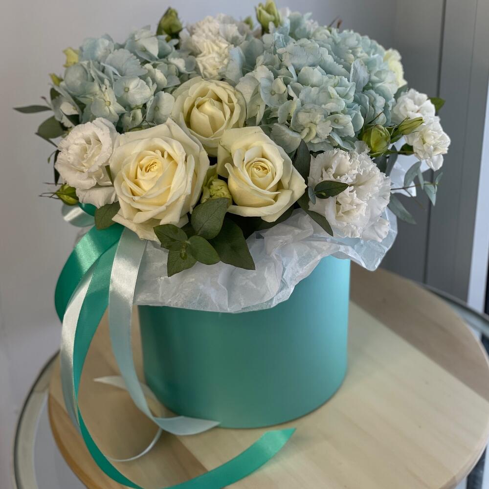 Гортензия - 1 шт. Эвкалипт - 2 шт. Лента атласная - 2 шт. Диантус - 1 шт. Коробка - 1 шт. Лизиантус Алиса белый - 3 шт. Оазис флористический - 1 шт. Бумага тишью - 1 шт. розы - 5 шт.