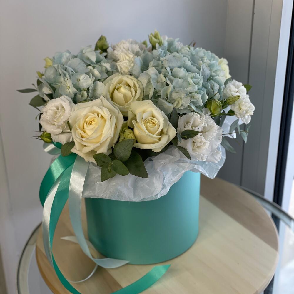 Гортензия – 1 шт. Эвкалипт – 2 шт. Лента атласная – 2 шт. Диантус – 1 шт. Коробка – 1 шт. Лизиантус Алиса белый – 3 шт. Оазис флористический – 1 шт. Бумага тишью – 1 шт. розы – 5 шт.