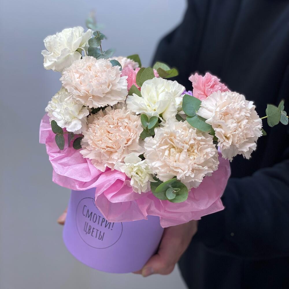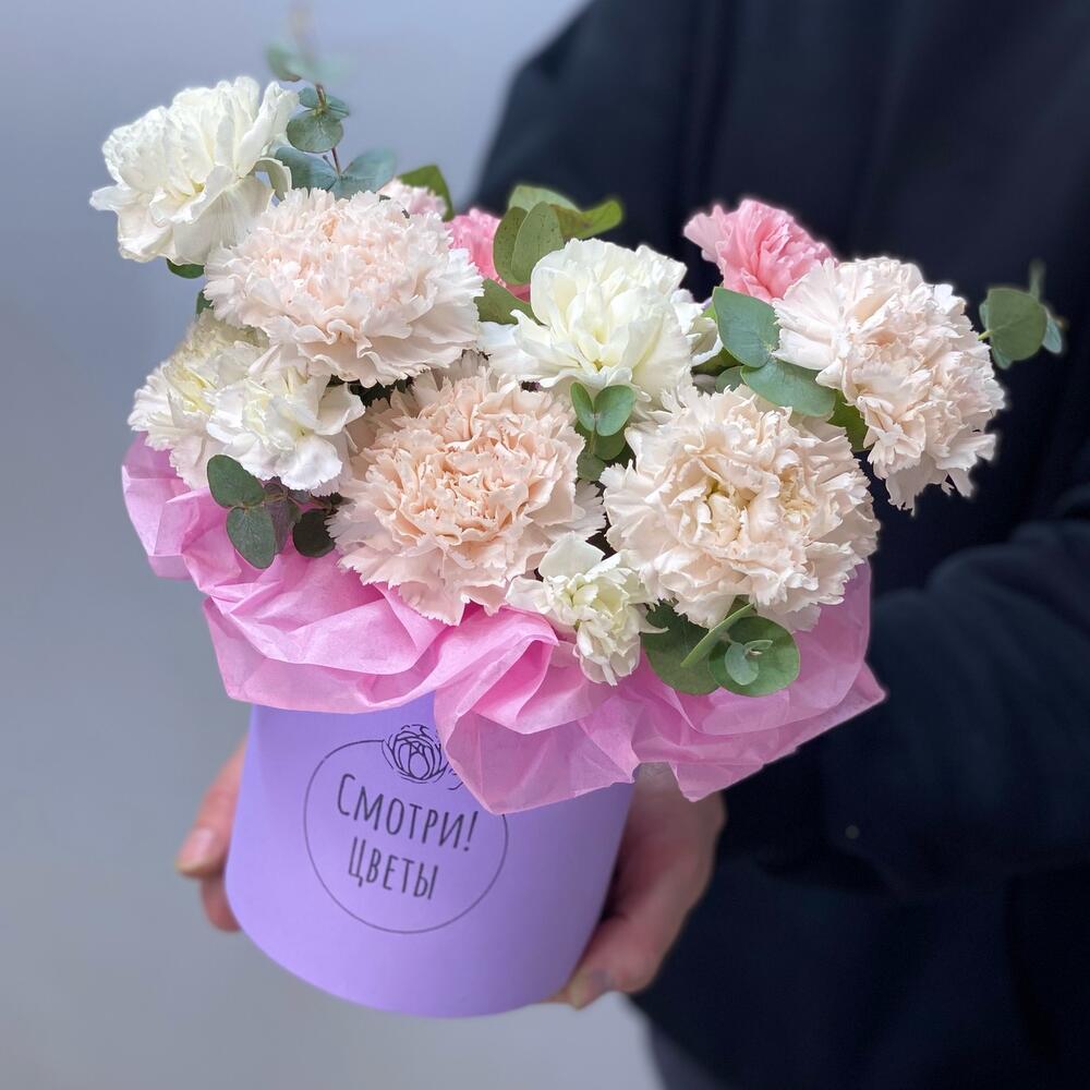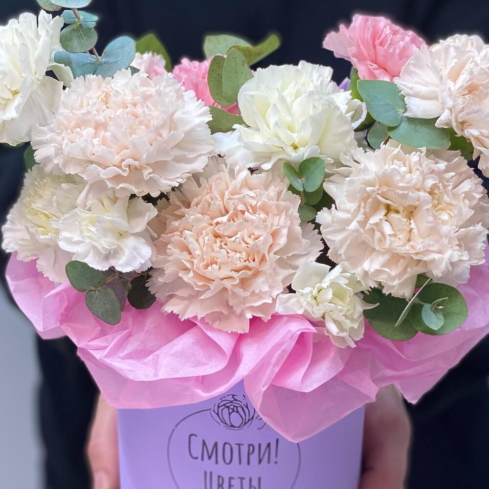 Коробка с кремовыми гвоздиками и ароматным эвкалиптом Невероятно стойкая композиция которую можно заказать на доставку в Нижнем Новгороде Шляпная коробка с гвоздиками и эвкалиптом можно подарить на 8 марта, 14 февраля, день рождения, свадьбу, юбилей, как комплимент Фирменная открытка в подарок!