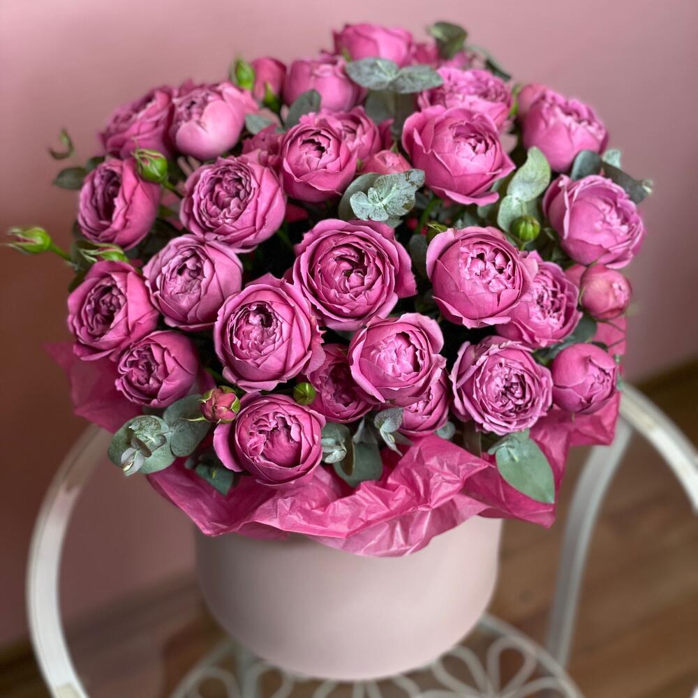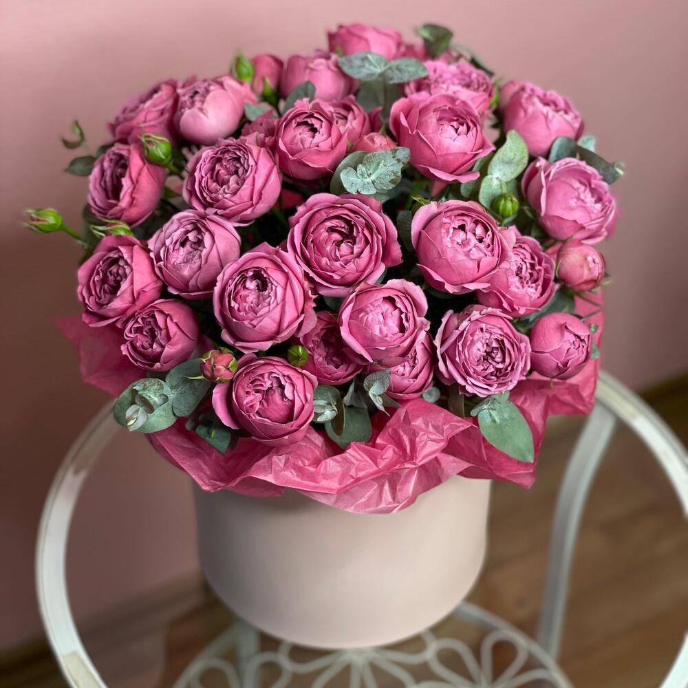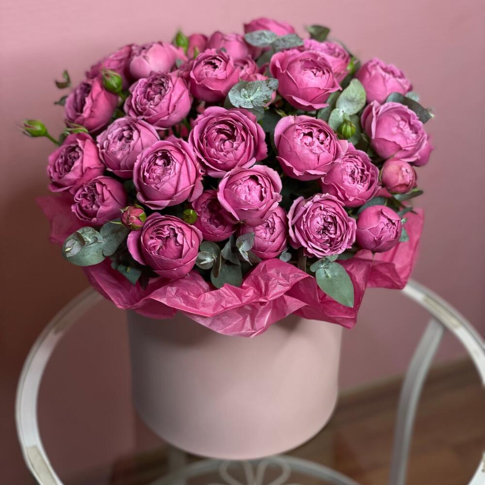 Эвкалипт - 3 шт. Коробка - 1 шт. Пионовидная кустовая роза - 7 шт. Оазис флористический - 1 шт. Бумага тишью - 2 шт.