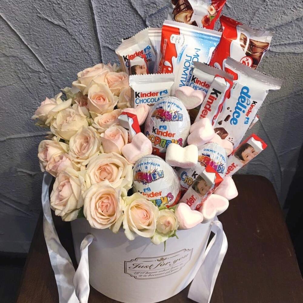 Коробка – 1 шт. Маршмеллоу – 50 гр. Киндер со злаками – 1 шт. Буэно – 2 шт. молочный ломтик – 1 шт. киндер палочками – 4 шт. кустовые розы – 5 шт. кинер сюрприз – 3 шт. киндер делишес – 1 шт.