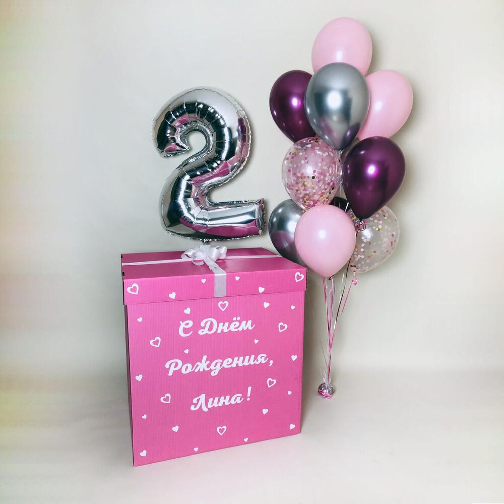 В наборе:Коробка -сюрприз с индивидуальной надписью и бантом, фонтан из 4 шара розовые, 6 шаров хром, 3 шарика конфетти, Цифра 👍