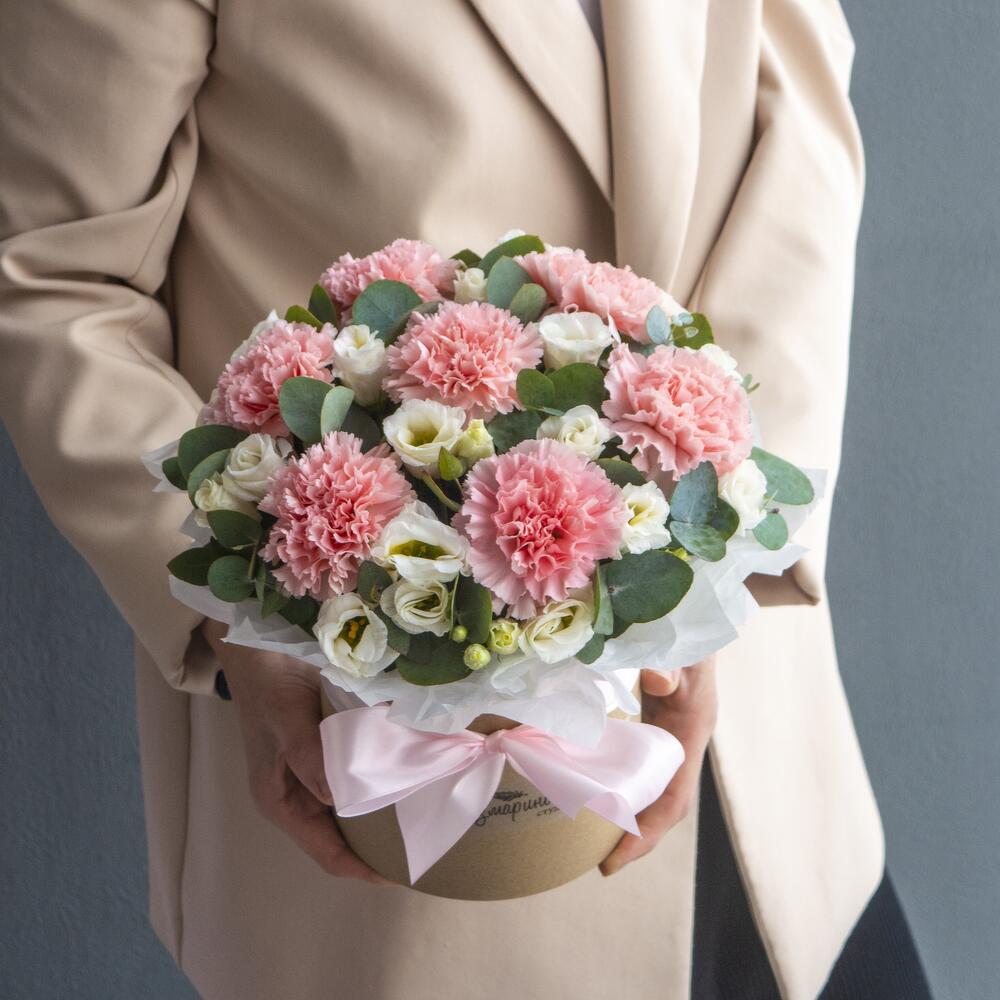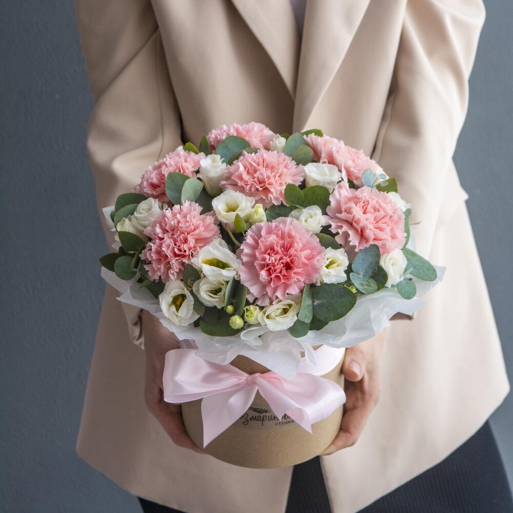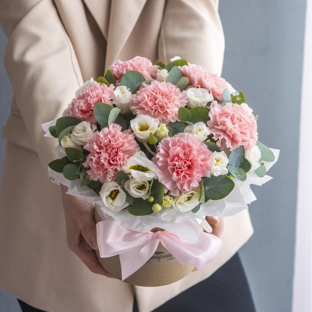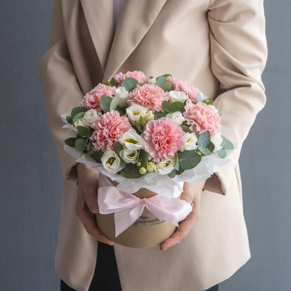 Нежная коробочка с розовыми гвоздиками, эустомой и ароматным эвкалиптом в стильной шляпной коробке