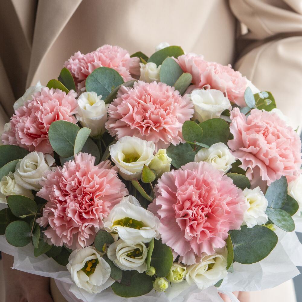 Коробочка розовых гвоздик с эустомой и эвкалиптом