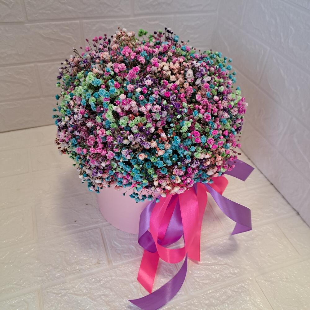 Лента атласная - 2 шт. Тишью - 2 шт. Коробка шляпная - 1 шт. Оазис флористический - 1 шт. гипсофила радужная - 9 шт.