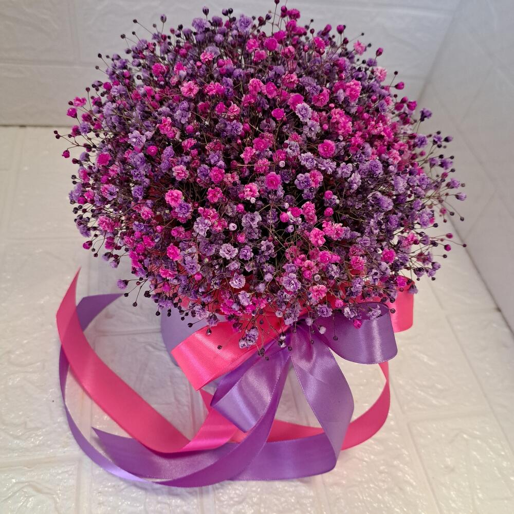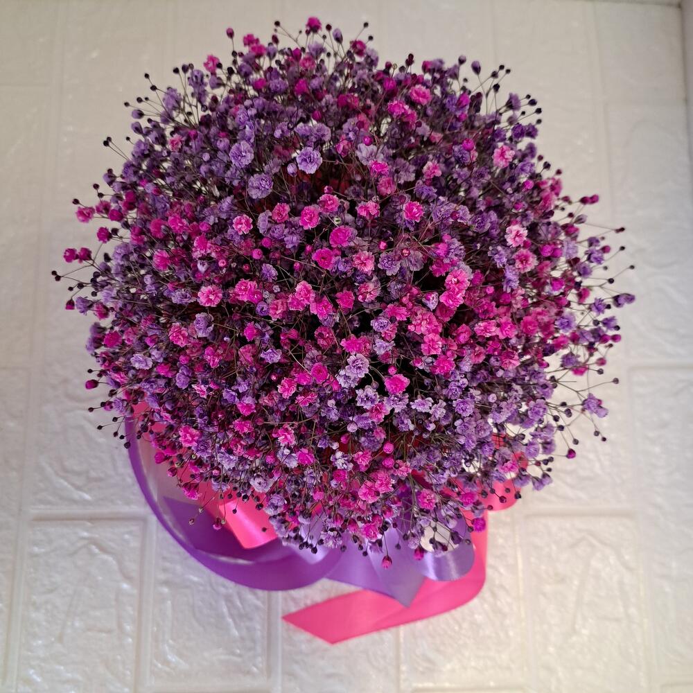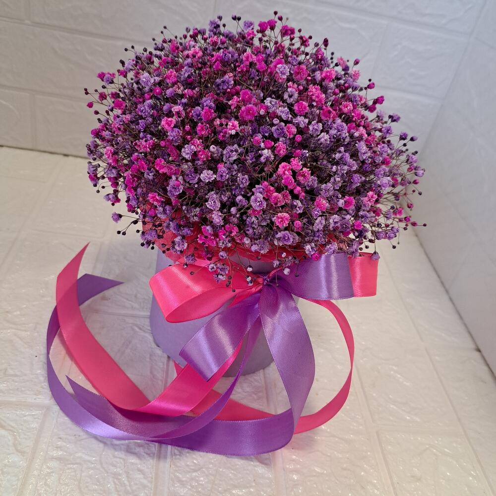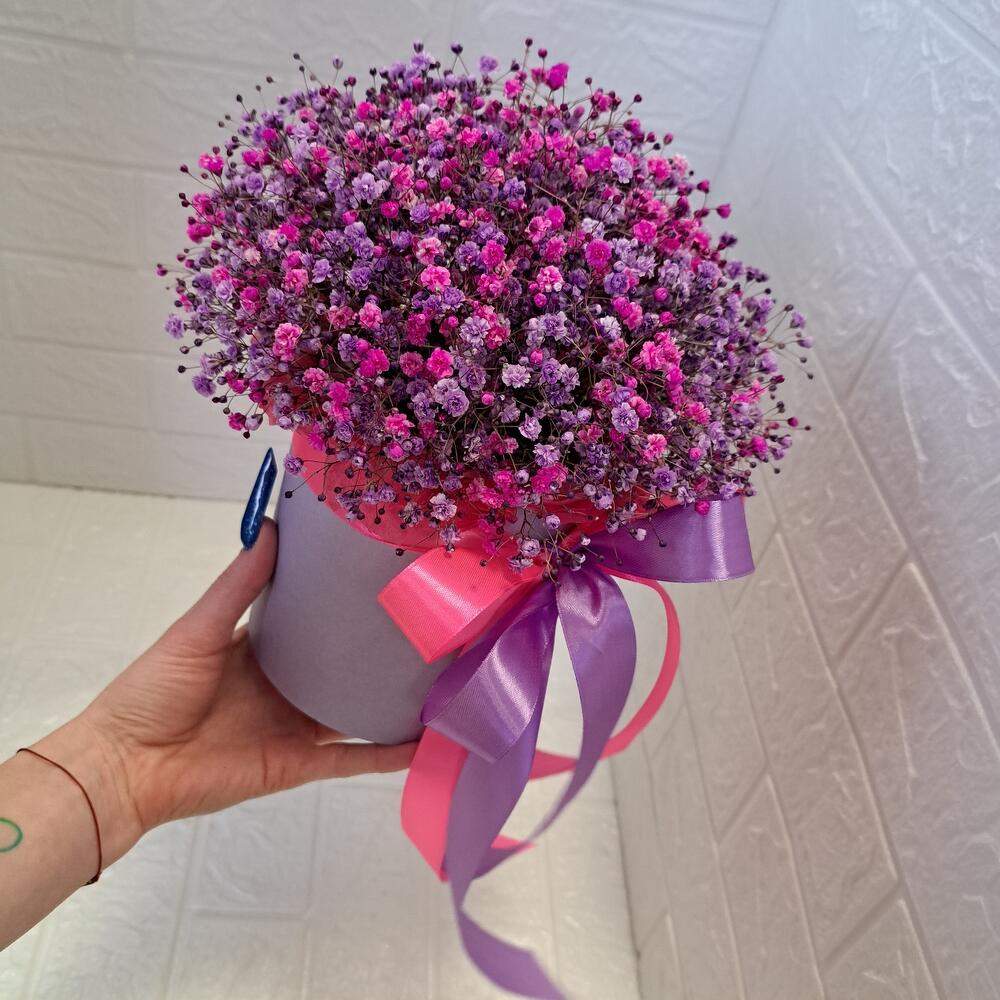 Лента атласная - 2 шт. Тишью - 1 шт. Коробка шляпная - 1 шт. Оазис флористический - 1 шт. гипсофила радужная - 6 шт.