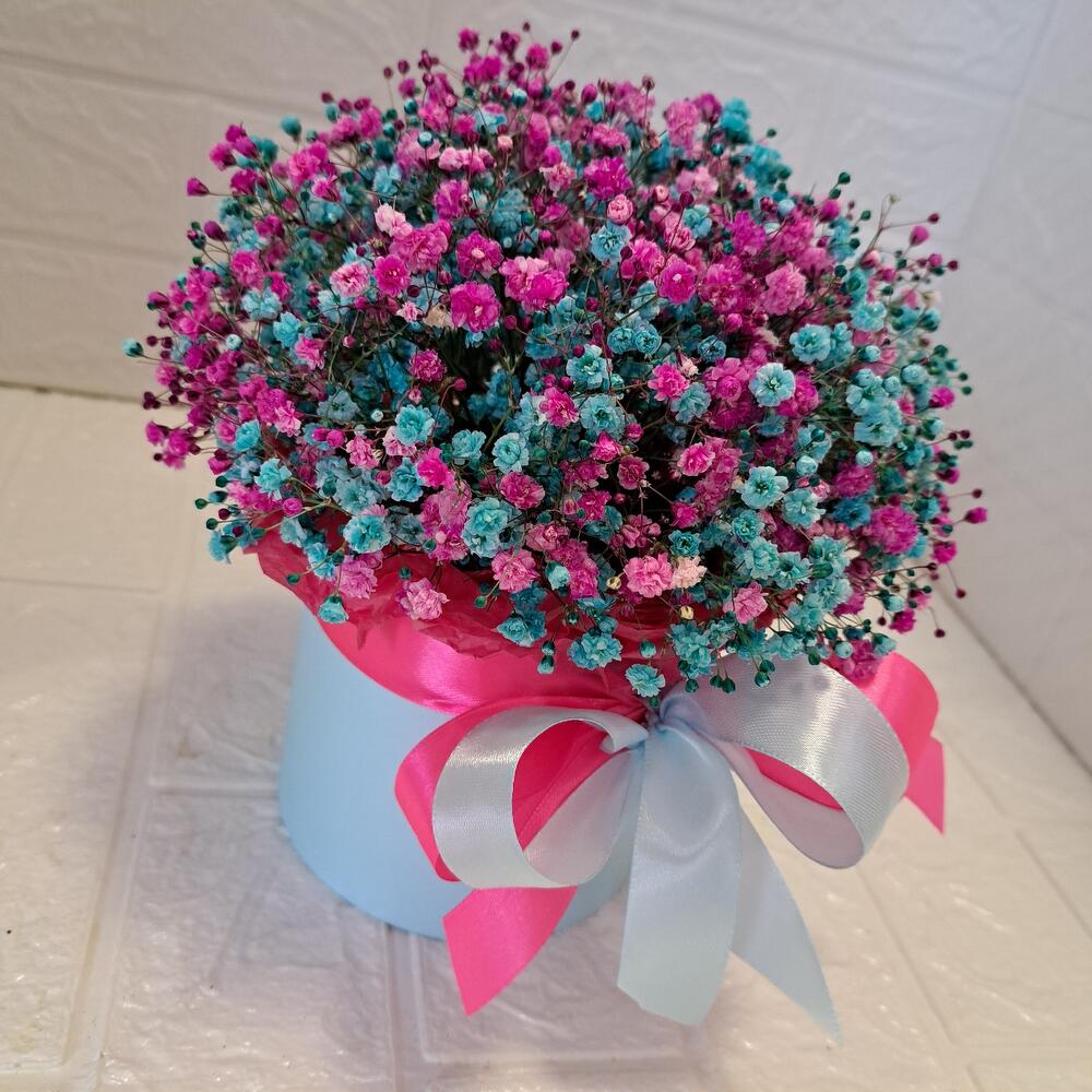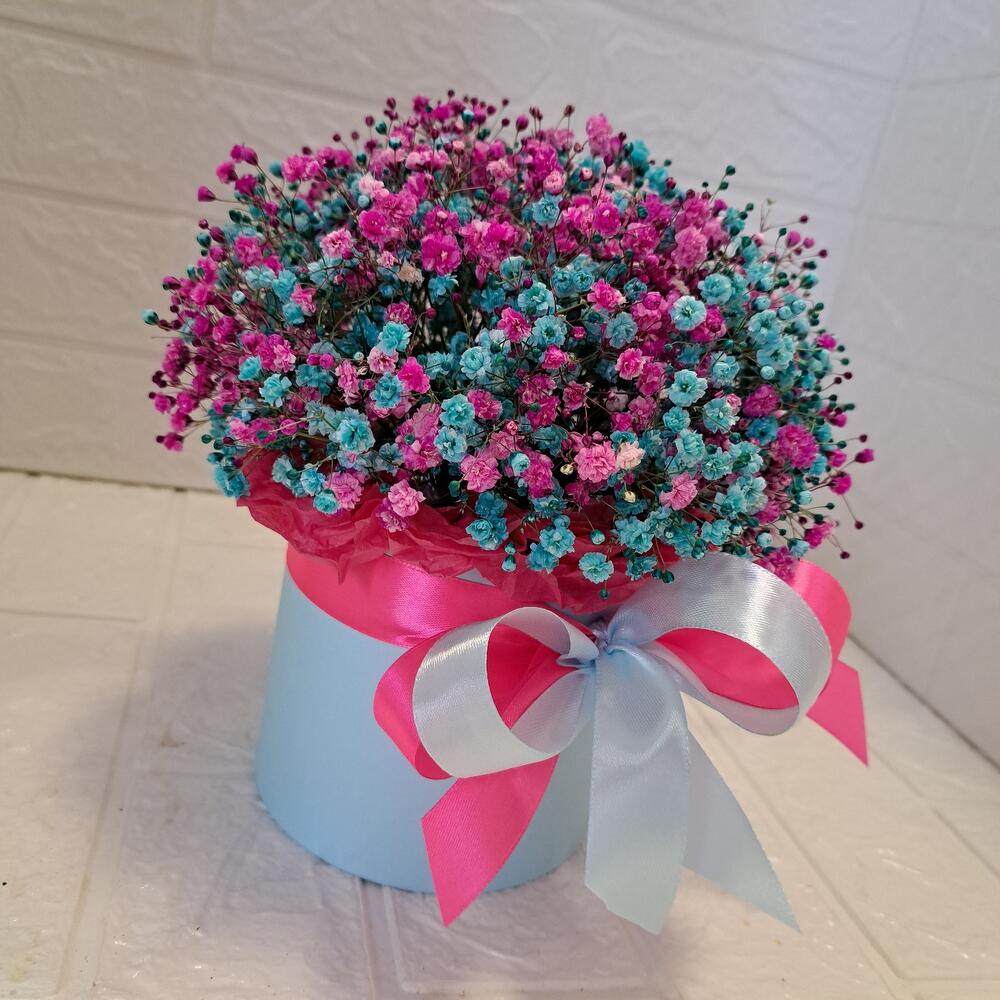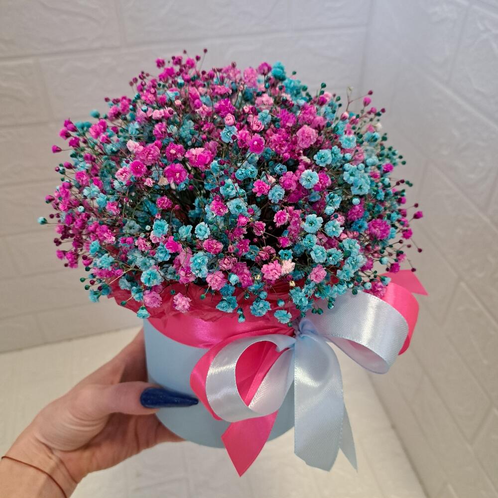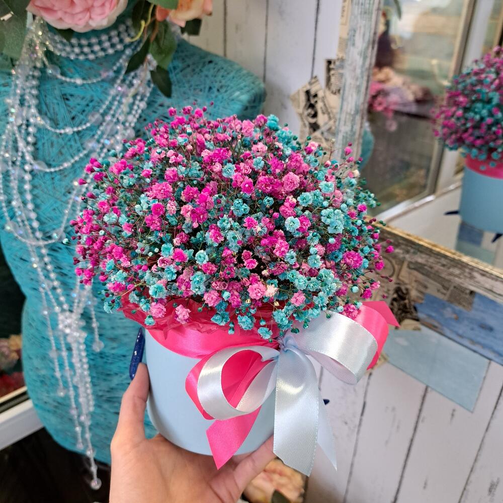 Лента атласная - 2 шт. Тишью - 1 шт. Коробка шляпная - 1 шт. Оазис флористический - 1 шт. гипсофила радужная - 6 шт.