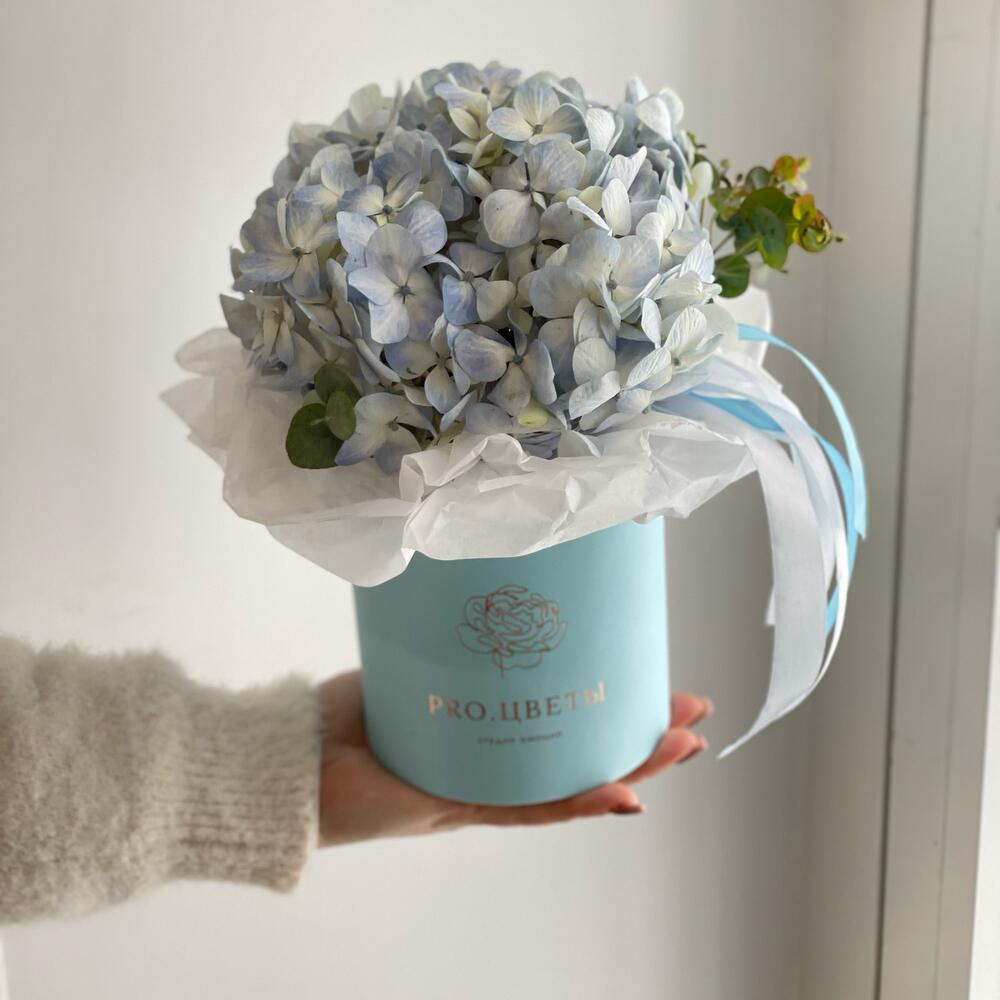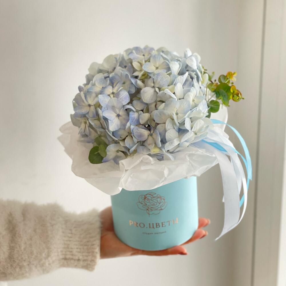 Гортензия - 1 шт. Эвкалипт - 1 шт. Лента атласная - 1 шт. Оазис флористический - 1 шт. Коробка брендированная - 1 шт. Бумага тишью - 1 шт.
