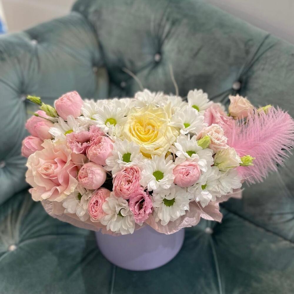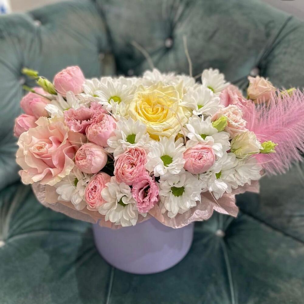 Хризантема кустовая – 4 шт. Кустовая роза – 2 шт. Роза Эквадор – 2 шт. Эустома – 1 шт. Коробка – 1 шт. Оазис флористический – 1 шт. перо декоративное – 1 шт.